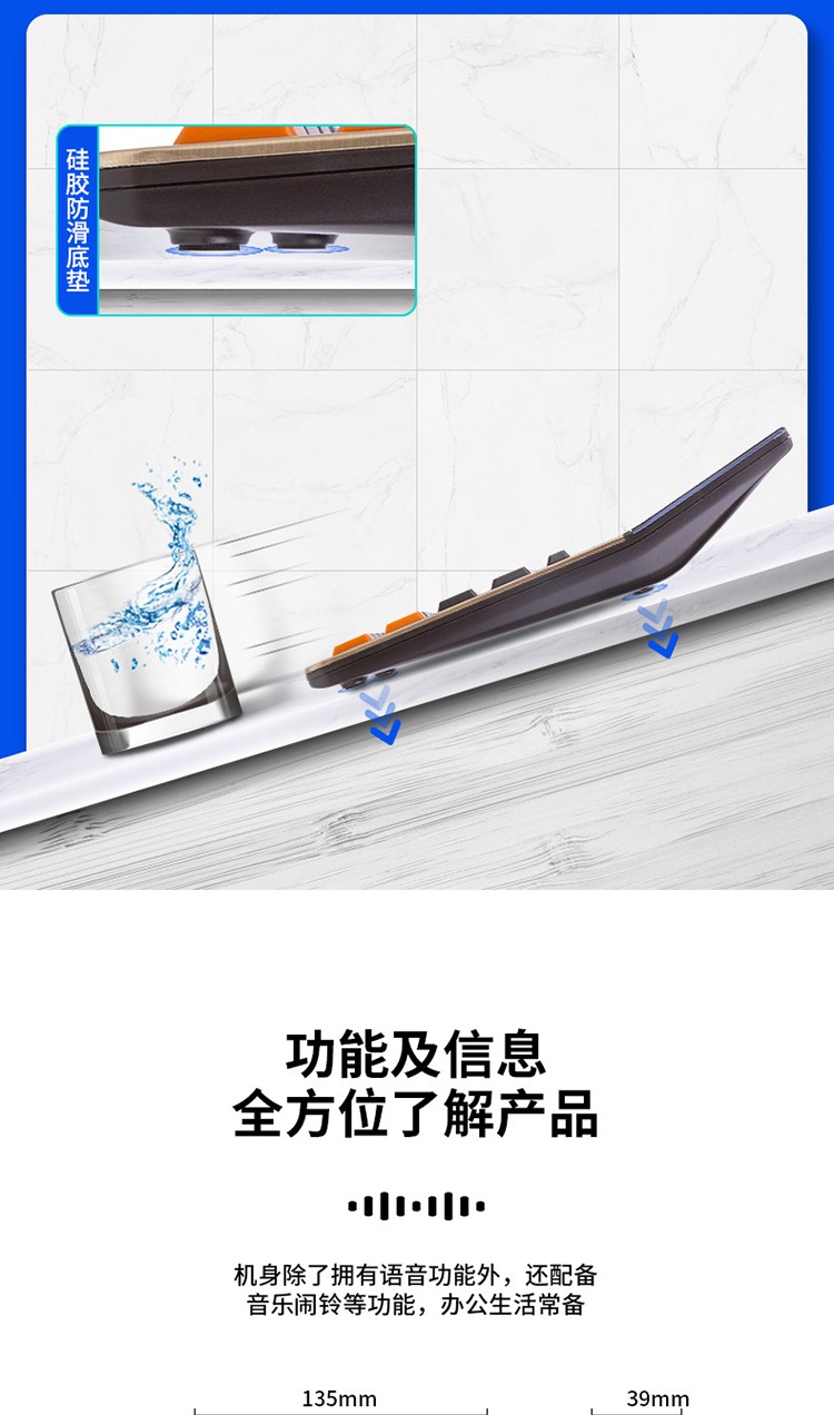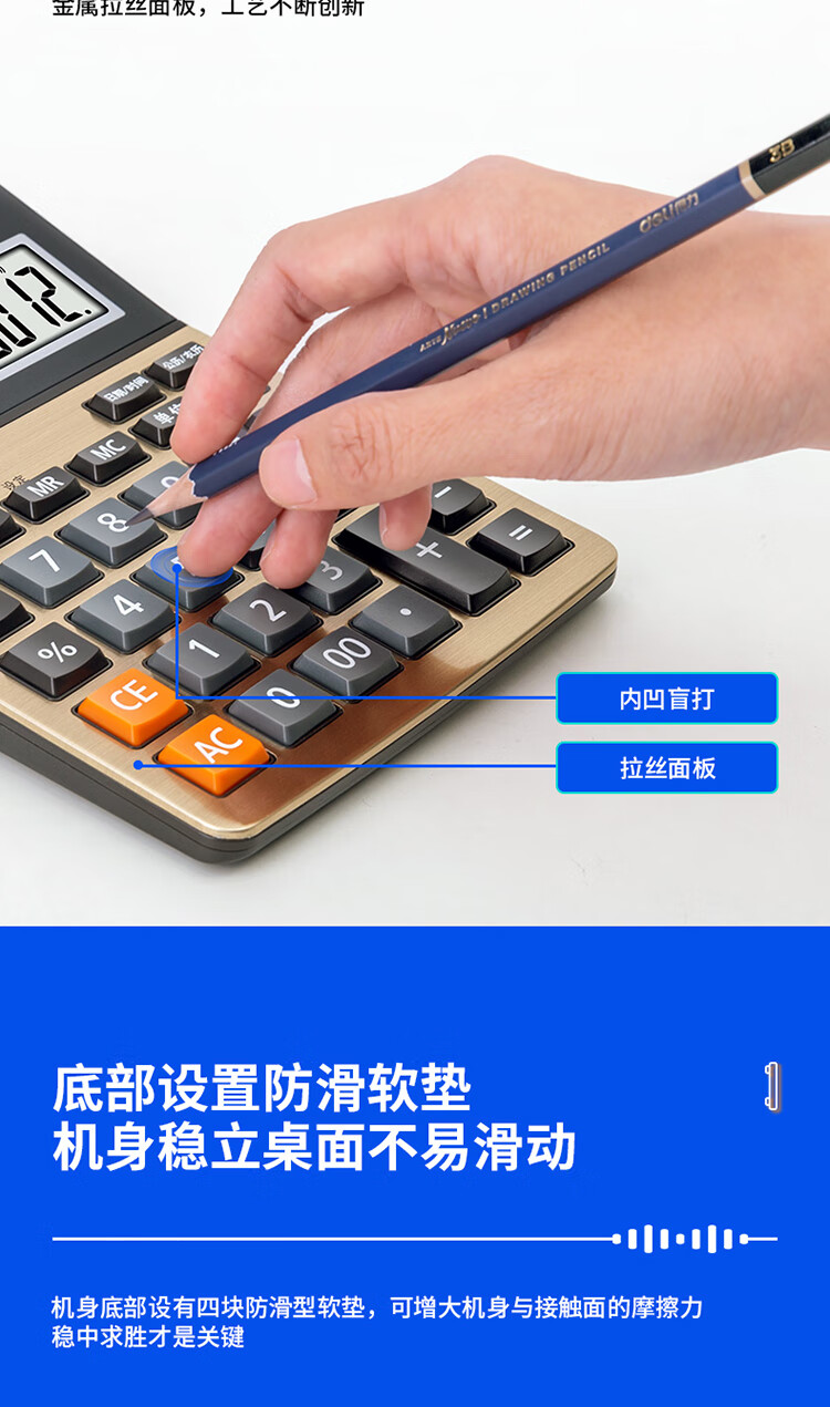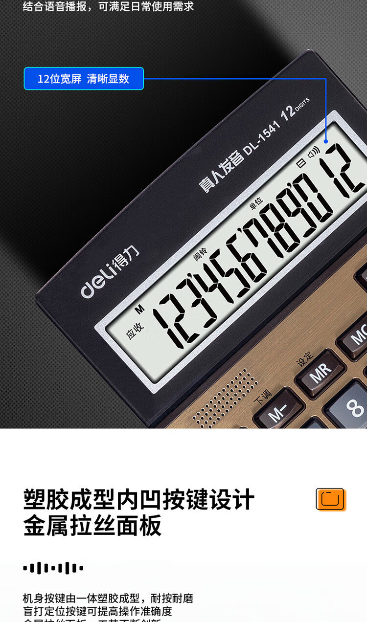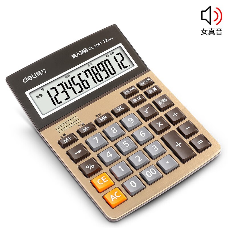 得力/deli 1541A 电子计算器 2位大屏幕语音计算器 闹钟日历功能语音计算机 学生/办公口算 办公用品 金色