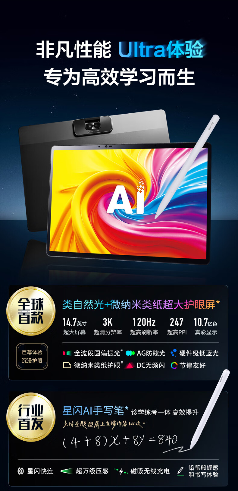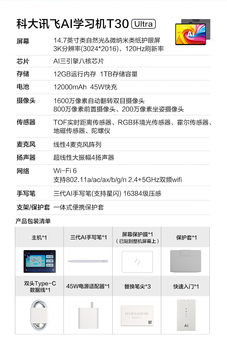 科大讯飞/iFLYTEK T30 Ultra平板式微型计算机 14.7英寸超大护眼屏 人工智能旗舰学习机 星火+DeepSeek双AI模型12+1T