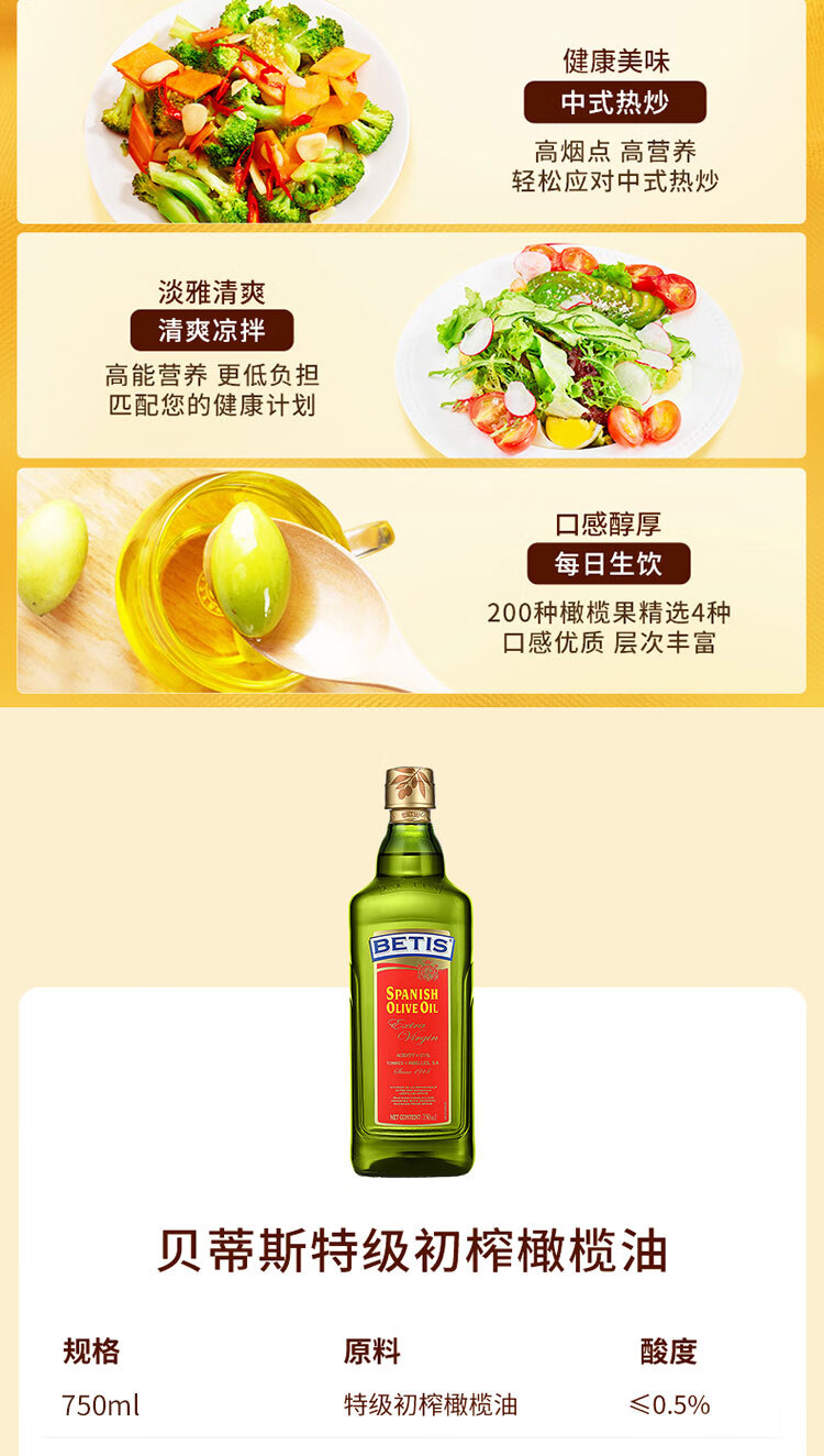 贝蒂斯/BETIS 750 橄榄油 特级初榨橄榄油 750ml/瓶 食用油 西班牙原装进口 单只礼盒