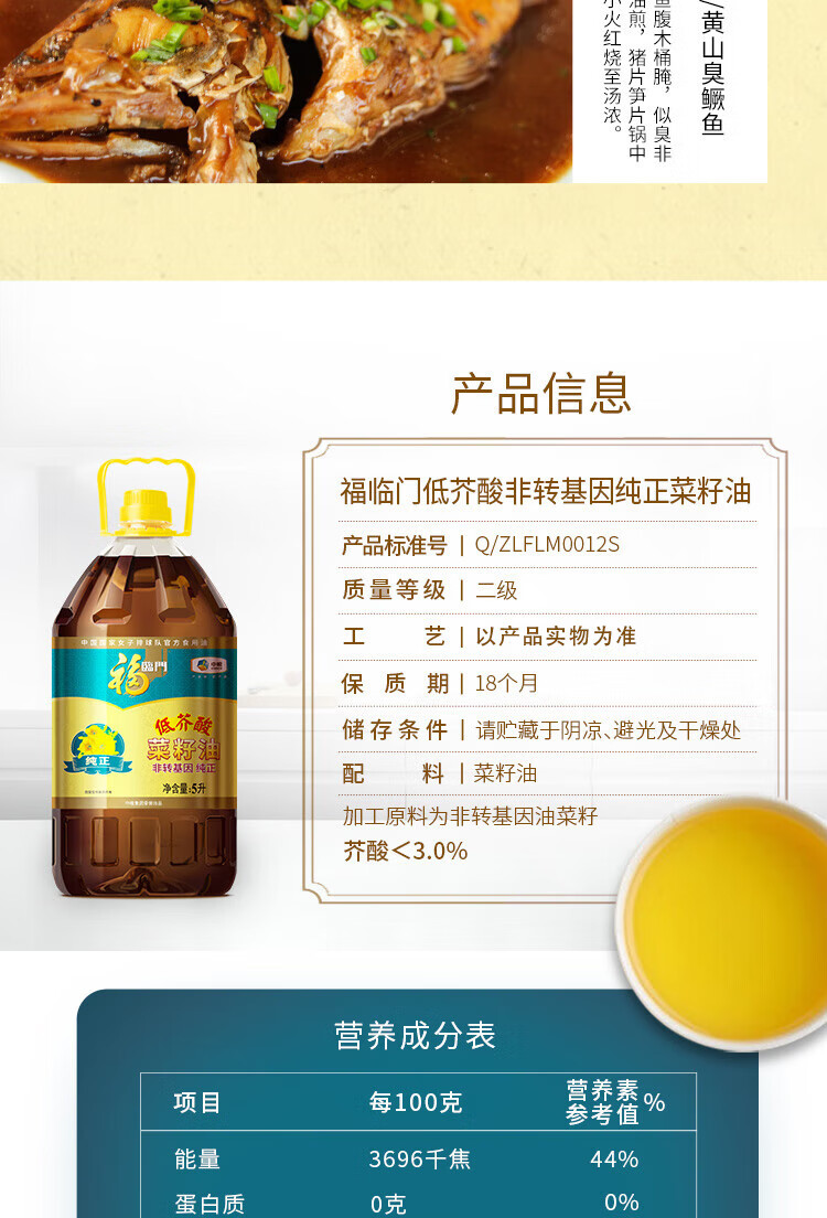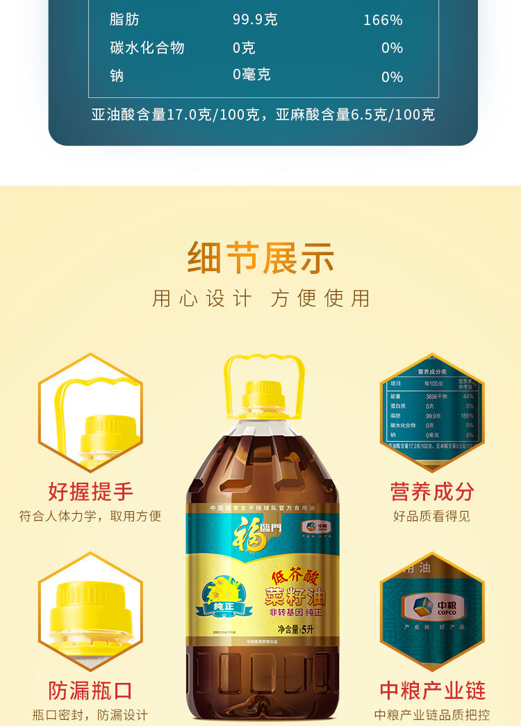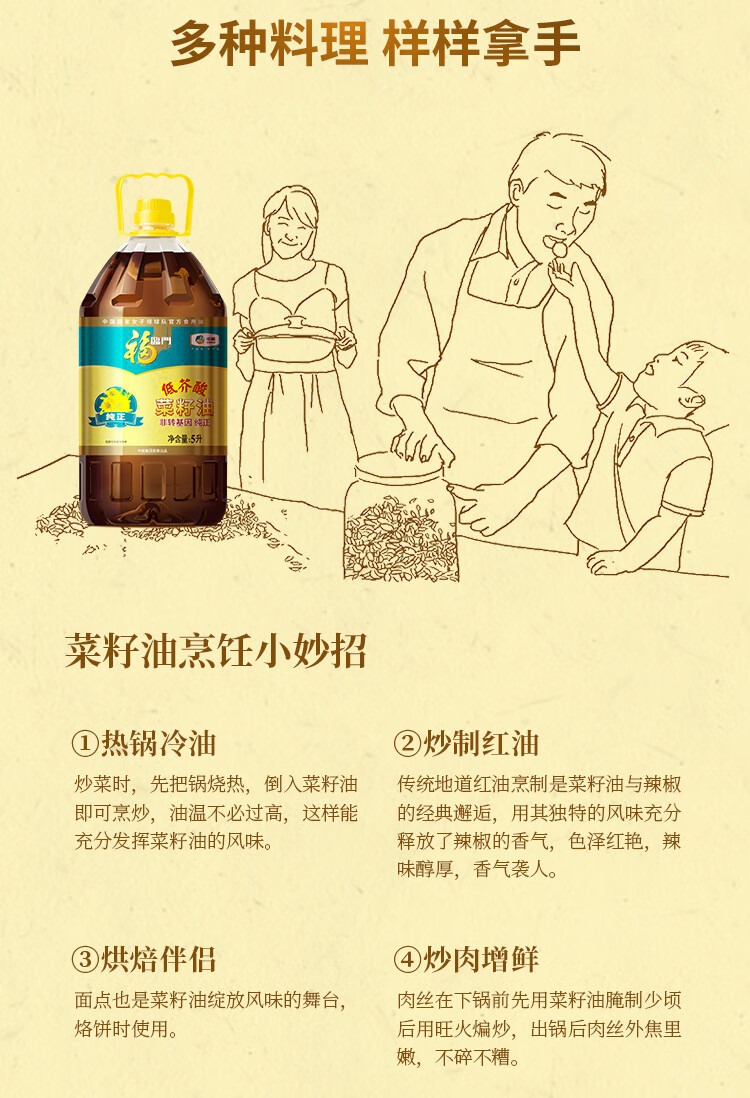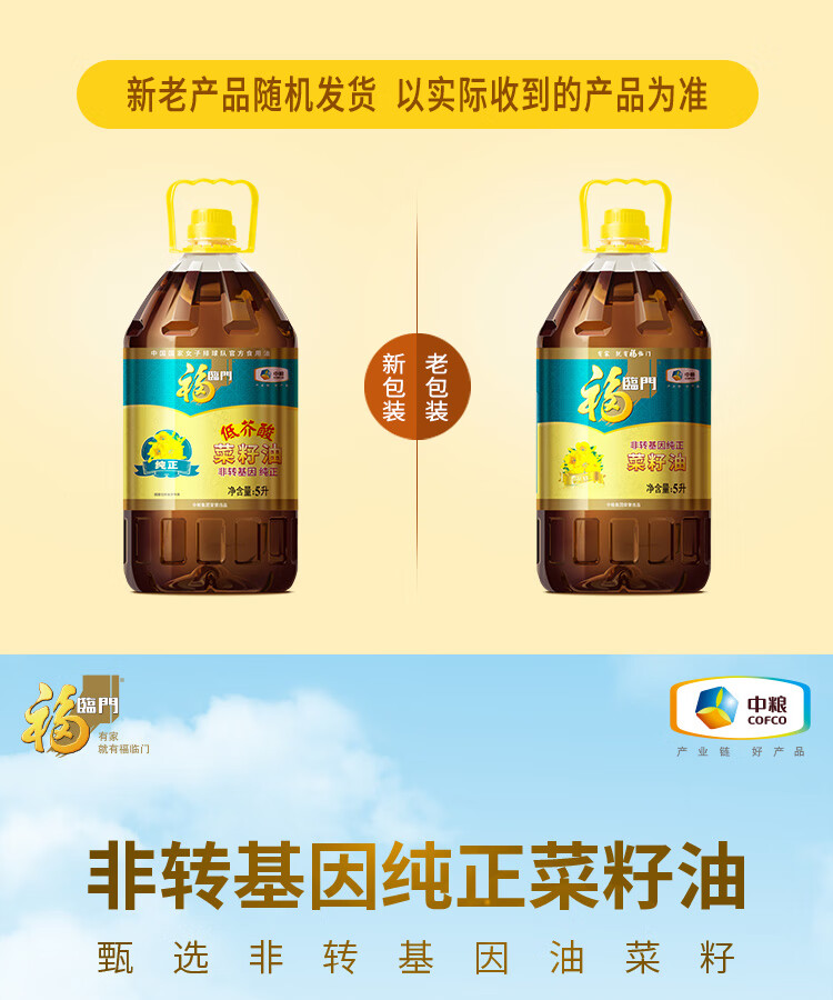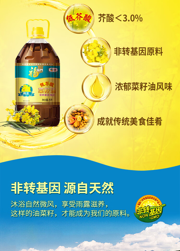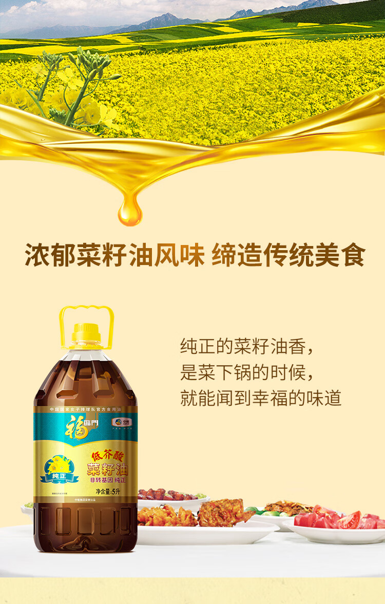 福临门 5L 菜籽油 低芥酸非转基因纯正菜籽油5L传统菜油风味精炼二级