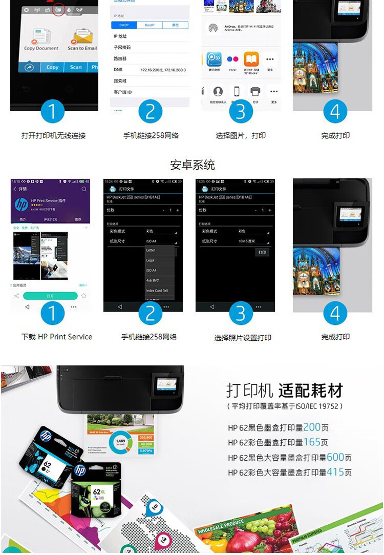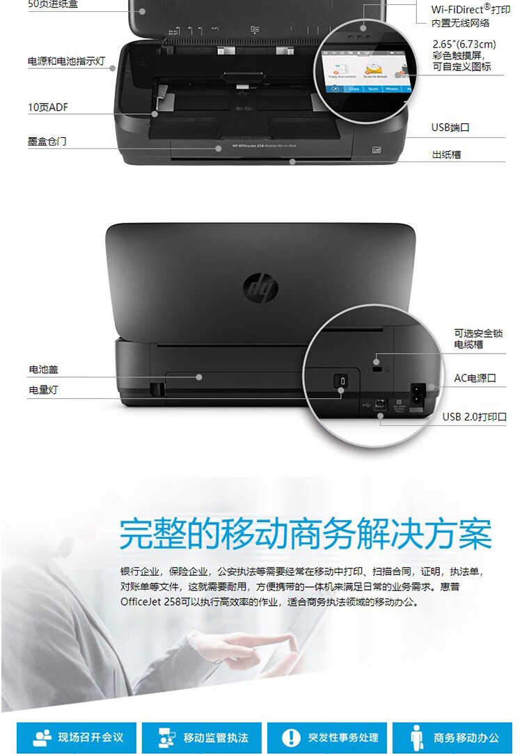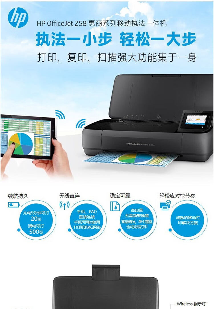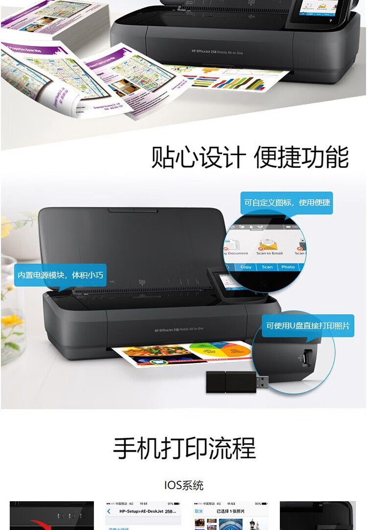 惠普/HP OfficeJet258 A4 彩色打印机 便携式打印机自带电池+手机无线直连打印