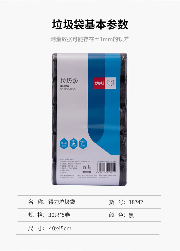 得力/deli 18742 塑料制品 5卷(150只)平底点断式办公生活大容量垃圾袋40*45cm 黑色