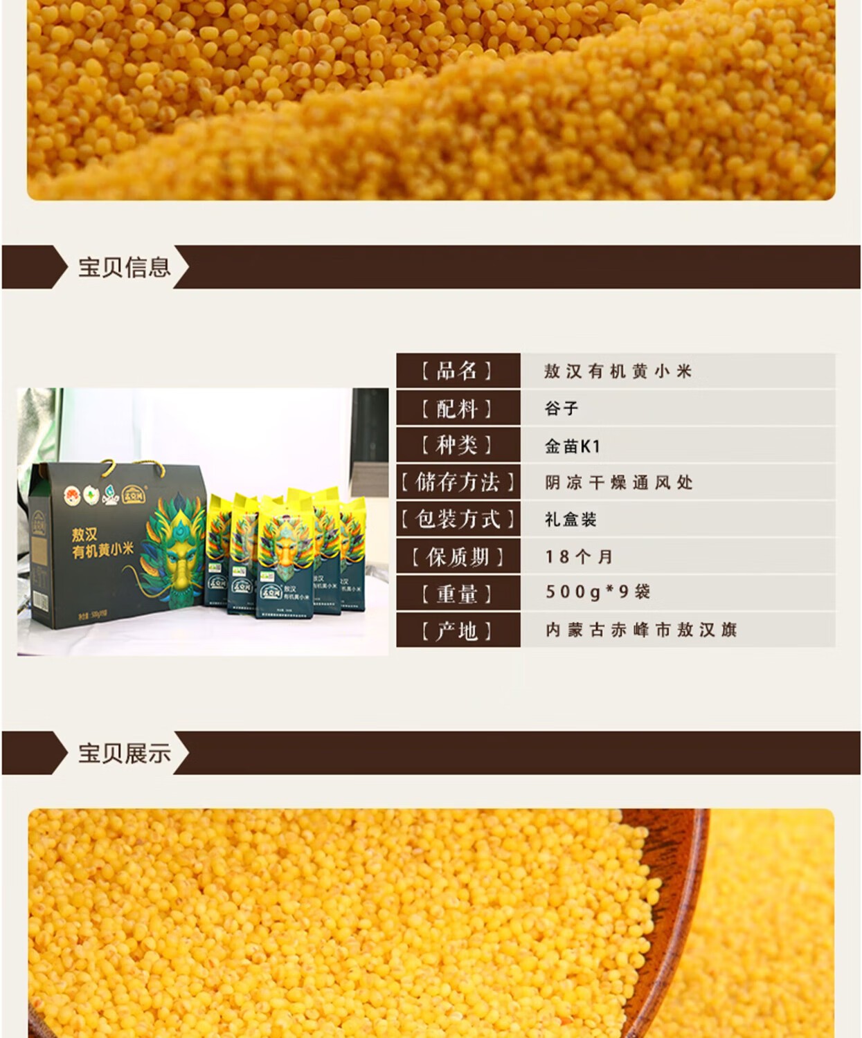 孟克河 4500 小米 有机敖汉精品黄小米金苗K1礼盒装4.5kg(500g*9)