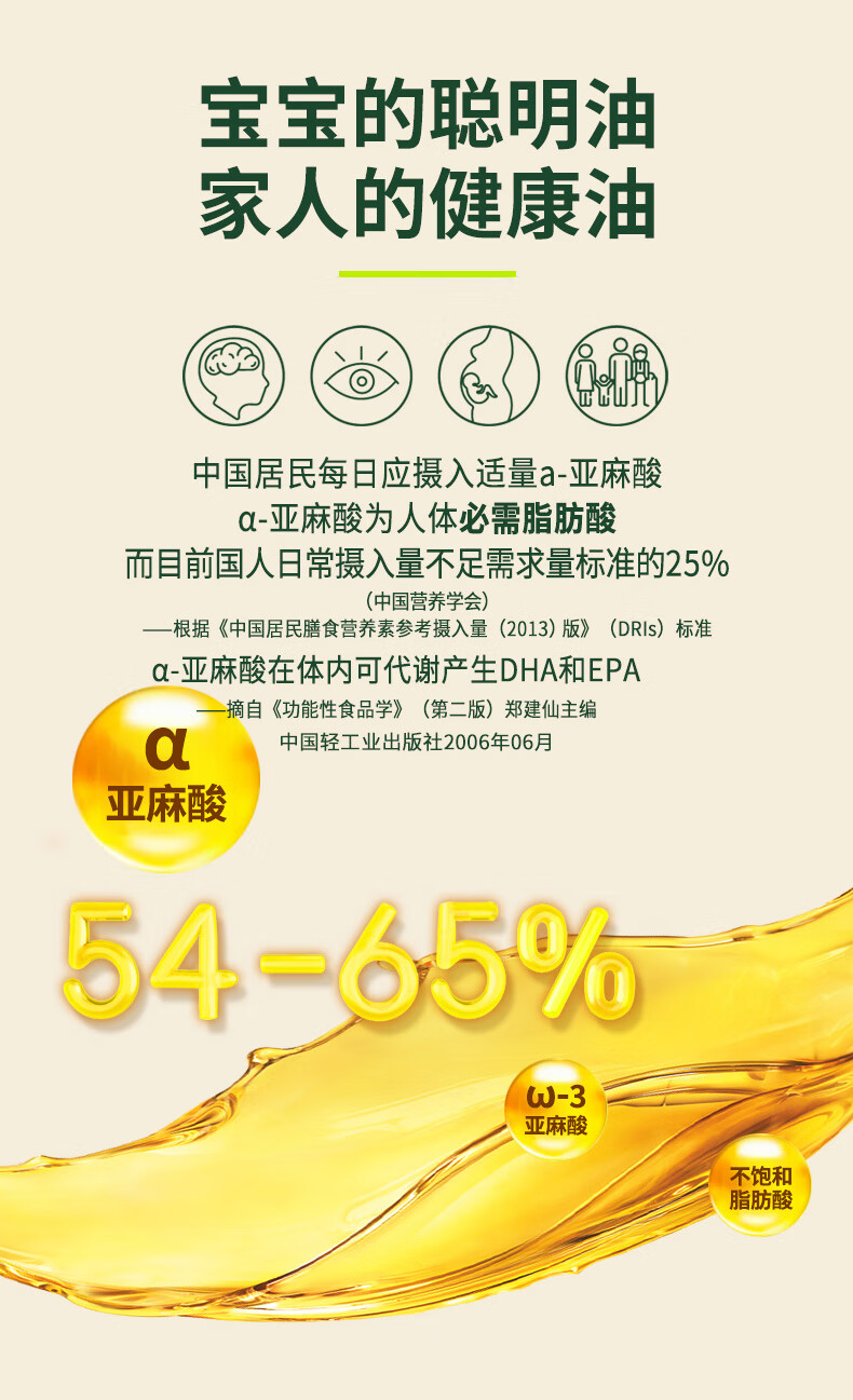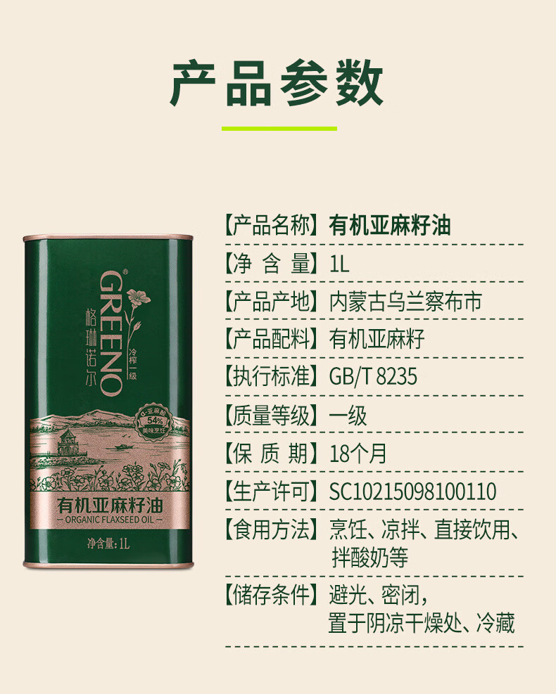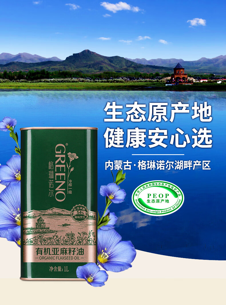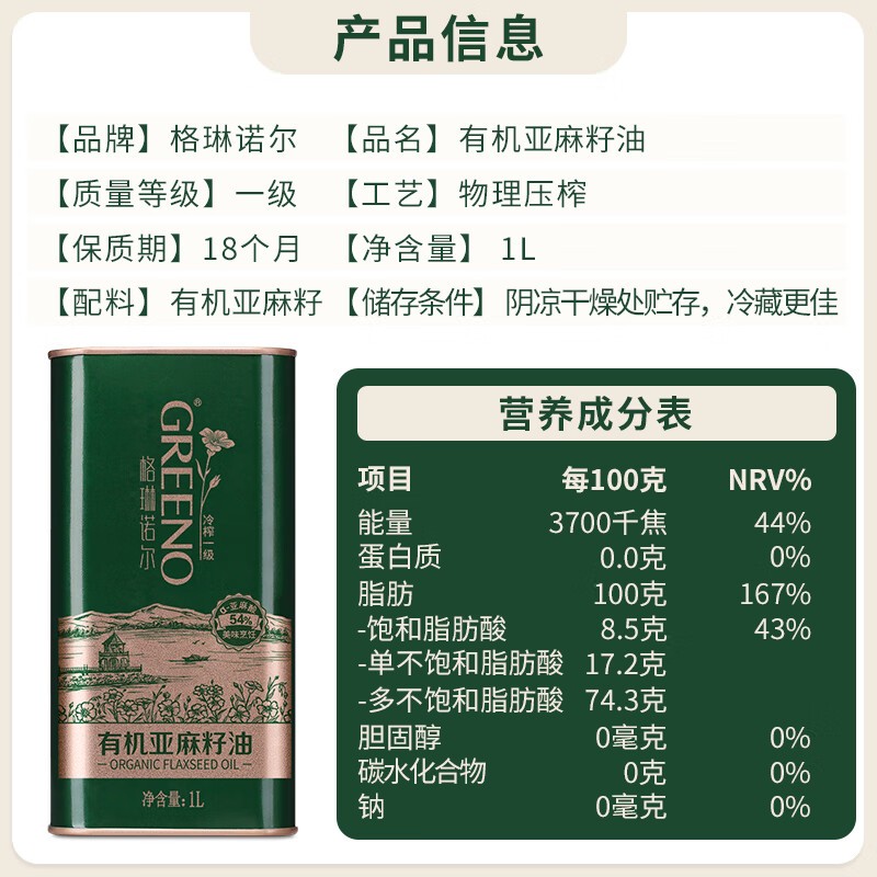 格琳诺尔 1000 冷榨亚麻籽油 有机亚麻籽油1L 适合于孕妇儿童冷榨脱蜡一级食用油月子油 1L装