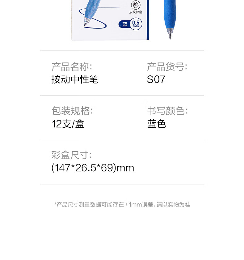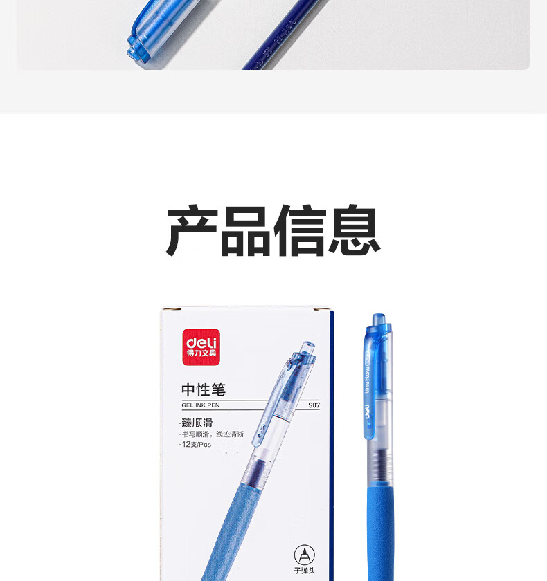 得力/deli S07 书写用笔类用具 臻顺滑中性笔签字笔 0.5mm子弹头按动笔水笔 办公用品学生中性笔 蓝色12支/盒S07