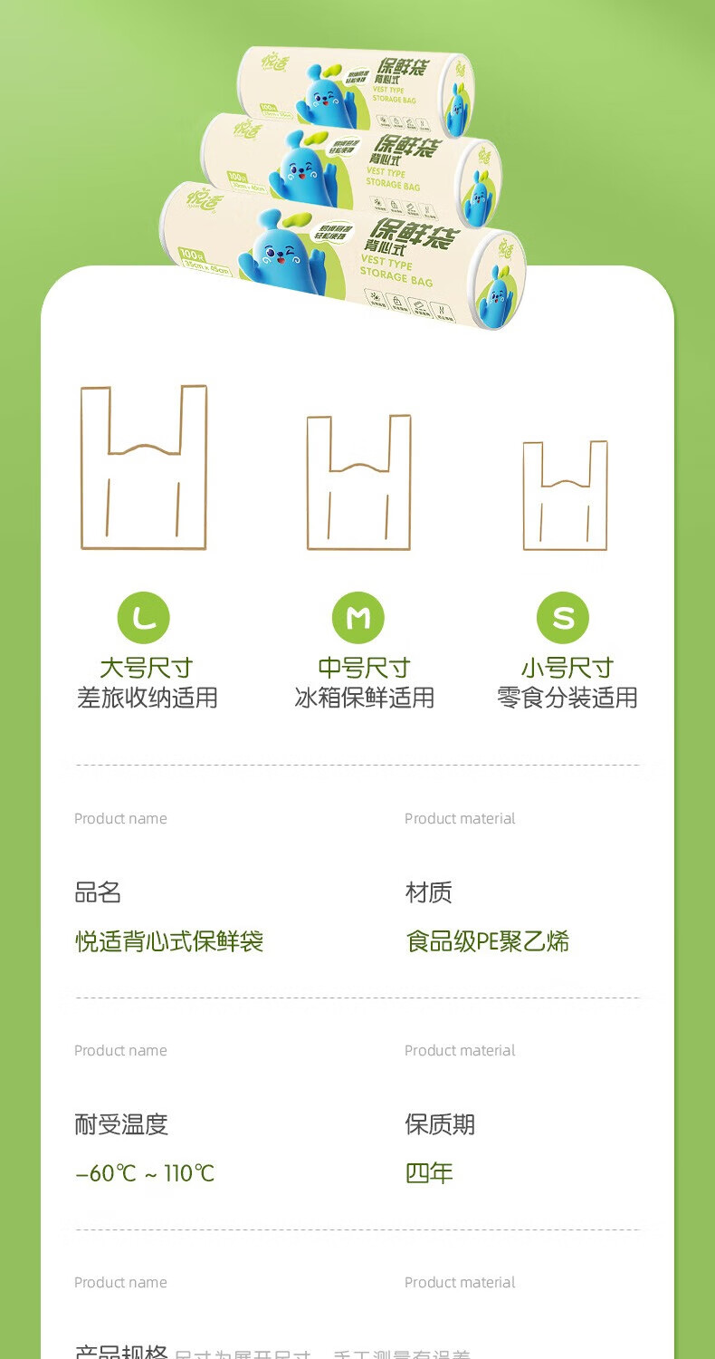 悦适/h\'yeas DJBD100 塑料制品 悦适背心式保鲜袋中号100只