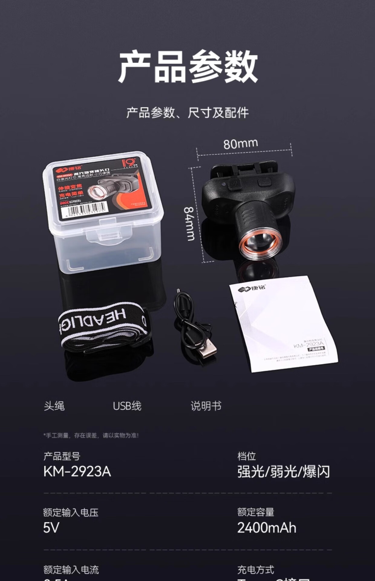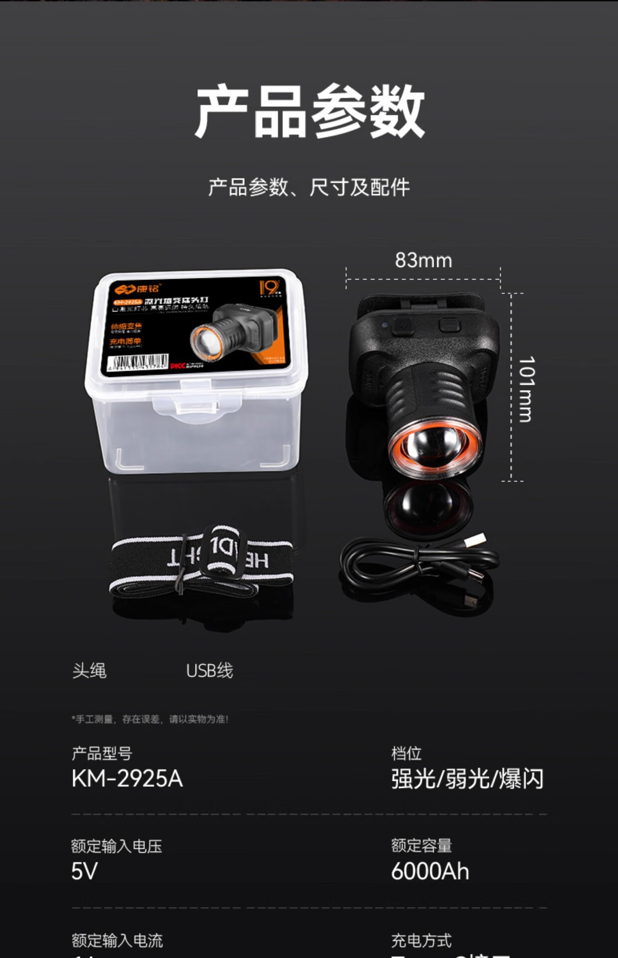 康铭/KANGMING KM-2925A 应急照明灯 LED充电光强光变焦爆亮应急夜晚钓鱼灯头戴式手电筒
