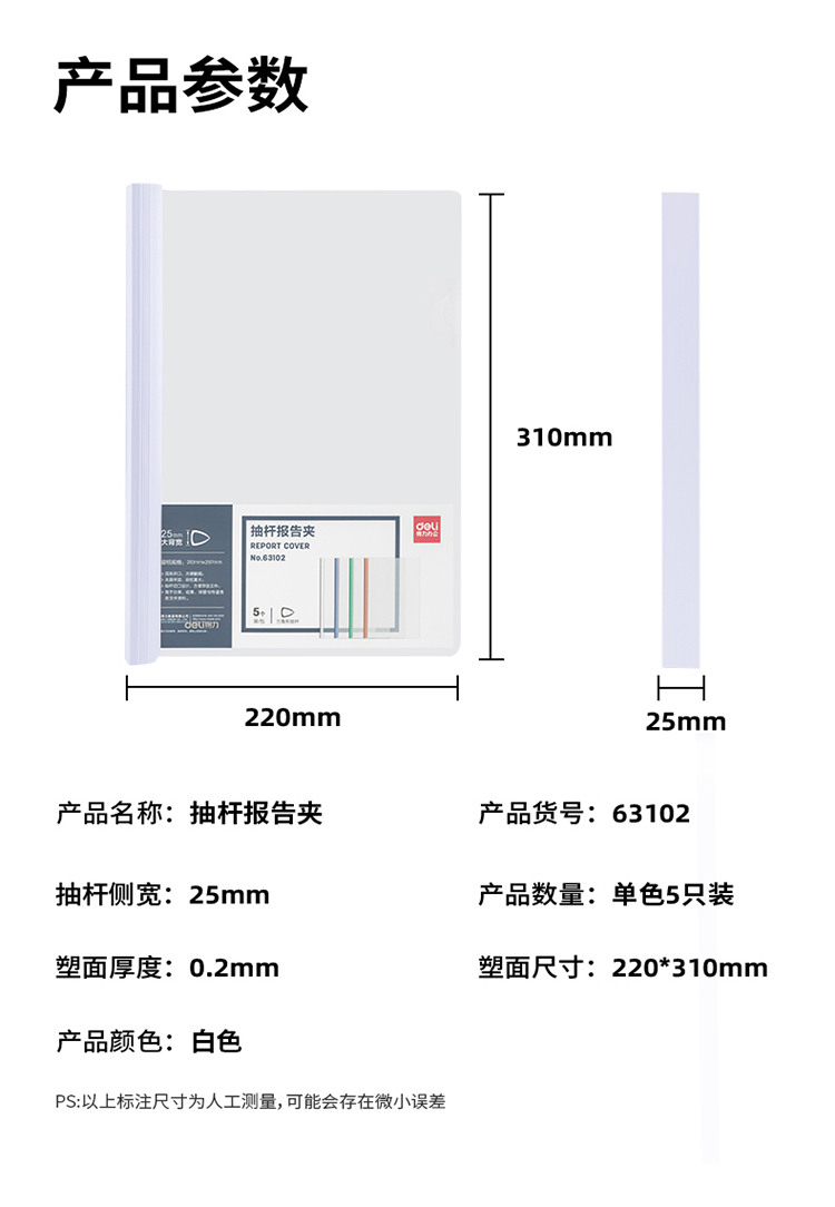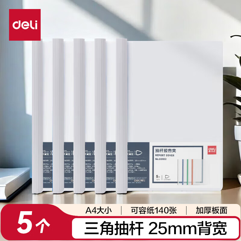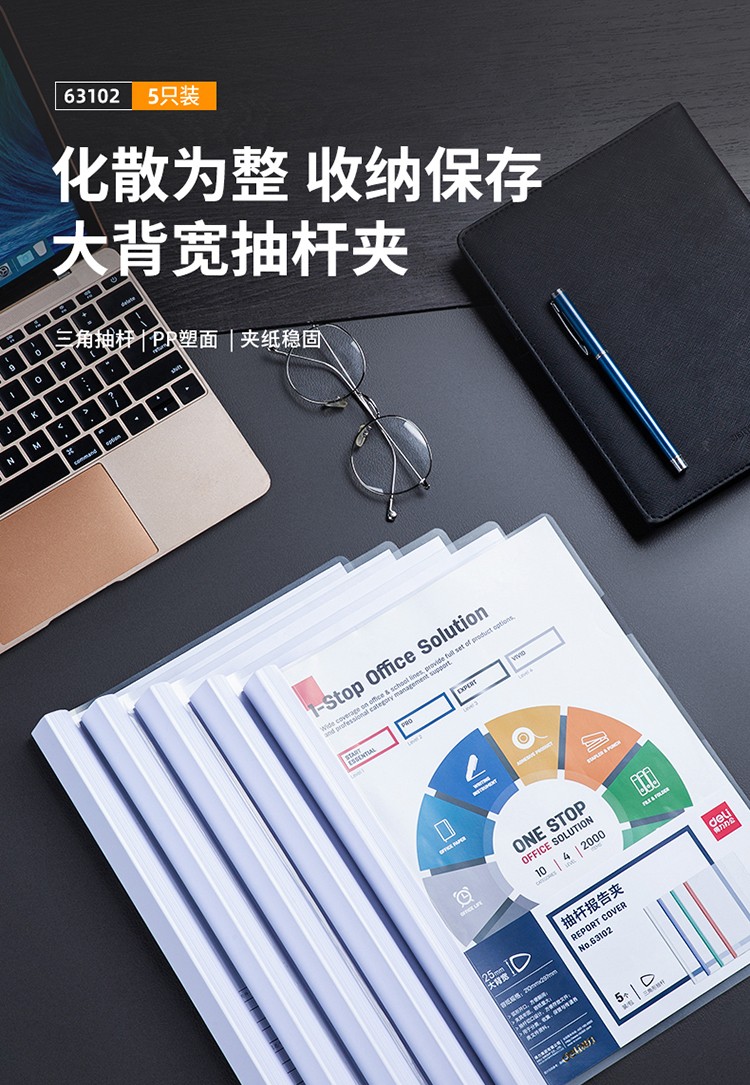 得力/deli 63102 文件夹 5只A4透明拉杆夹/抽杆夹/报告夹/文件夹 25mm大背宽简历报告夹 学生考试收纳