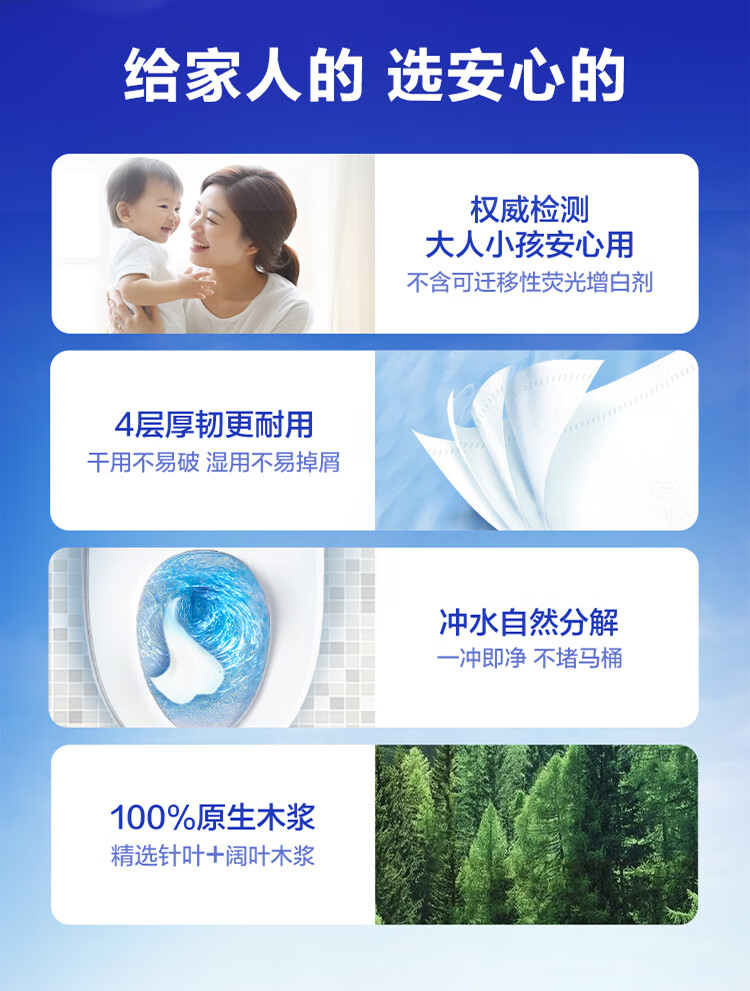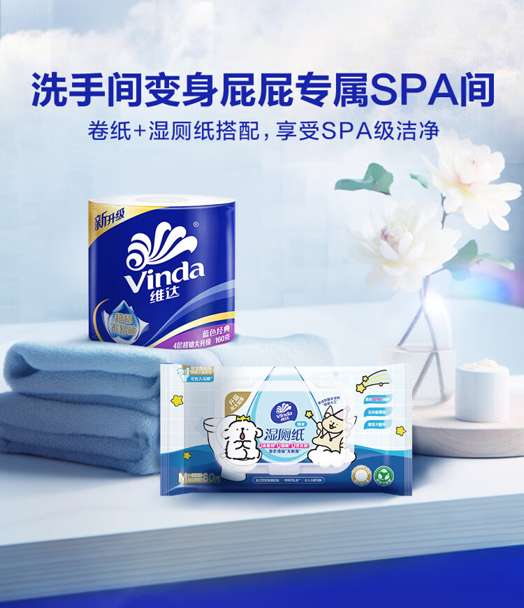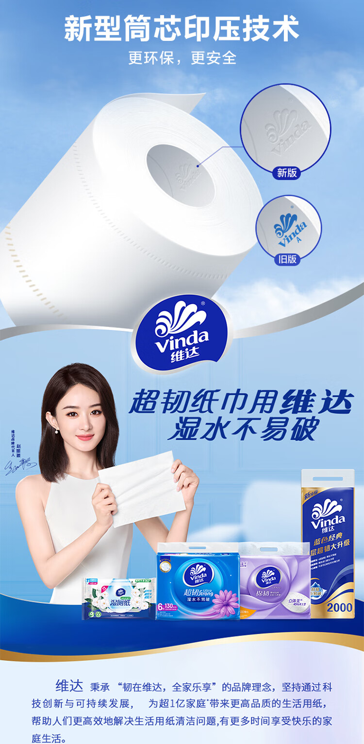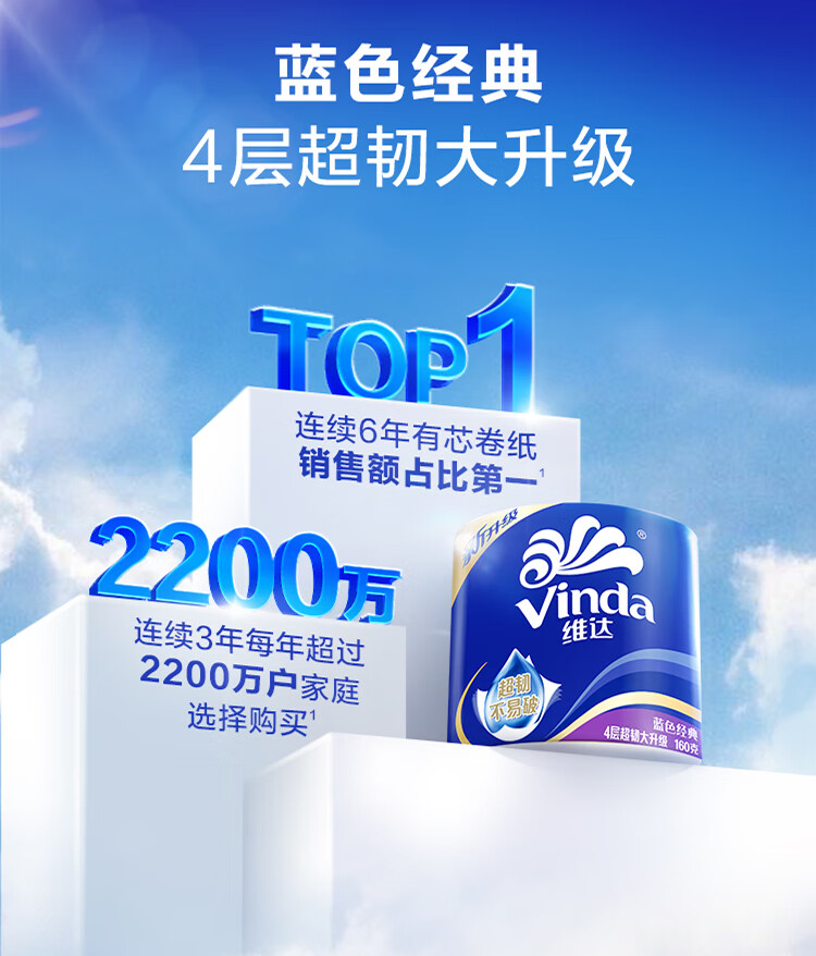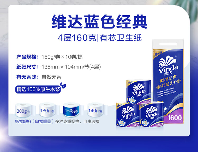 维达/Vinda V4068 卷类卫生纸 蓝色经典 4层 柔软家用卫生纸160克*3提