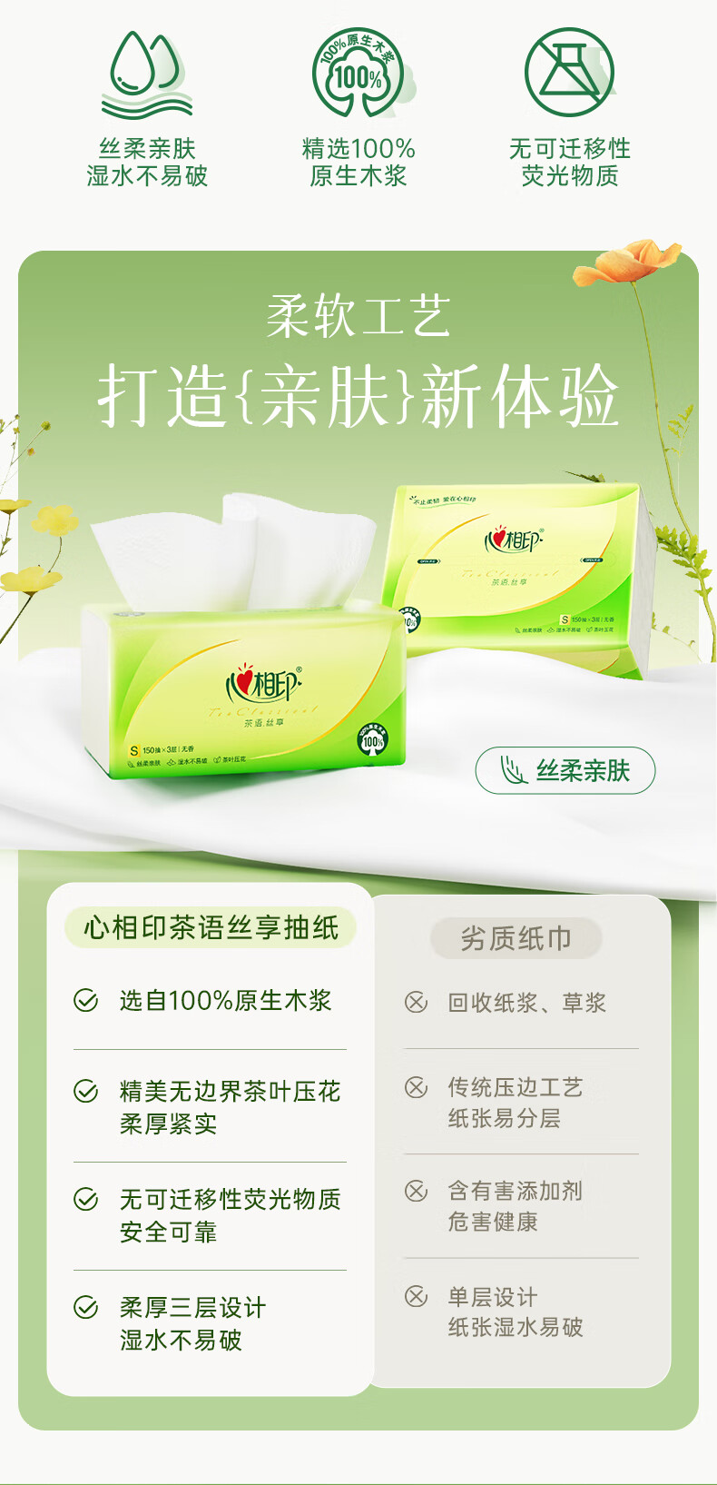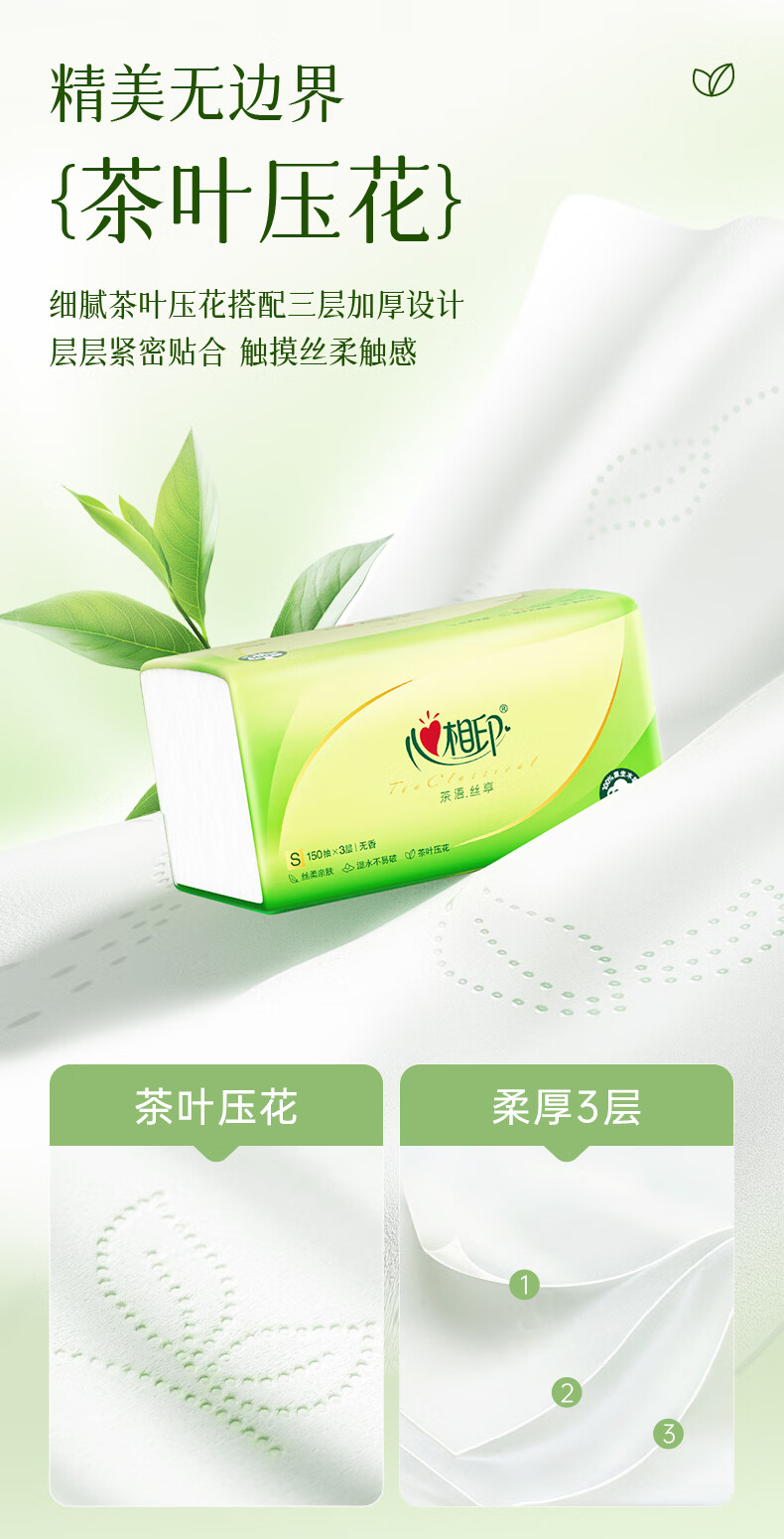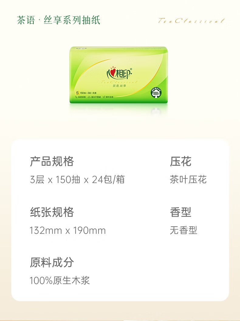 心相印/MindActUponMind DT15150 软包抽取式面纸 心相印茶语丝享系列150抽*24包三层塑装纸面巾