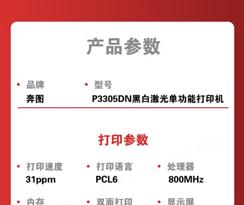 奔图/PANTUM P3305DN A4 黑白打印机 A4黑白激光单功能打印机 自动双面 网络打印 31页/分钟 国产信创