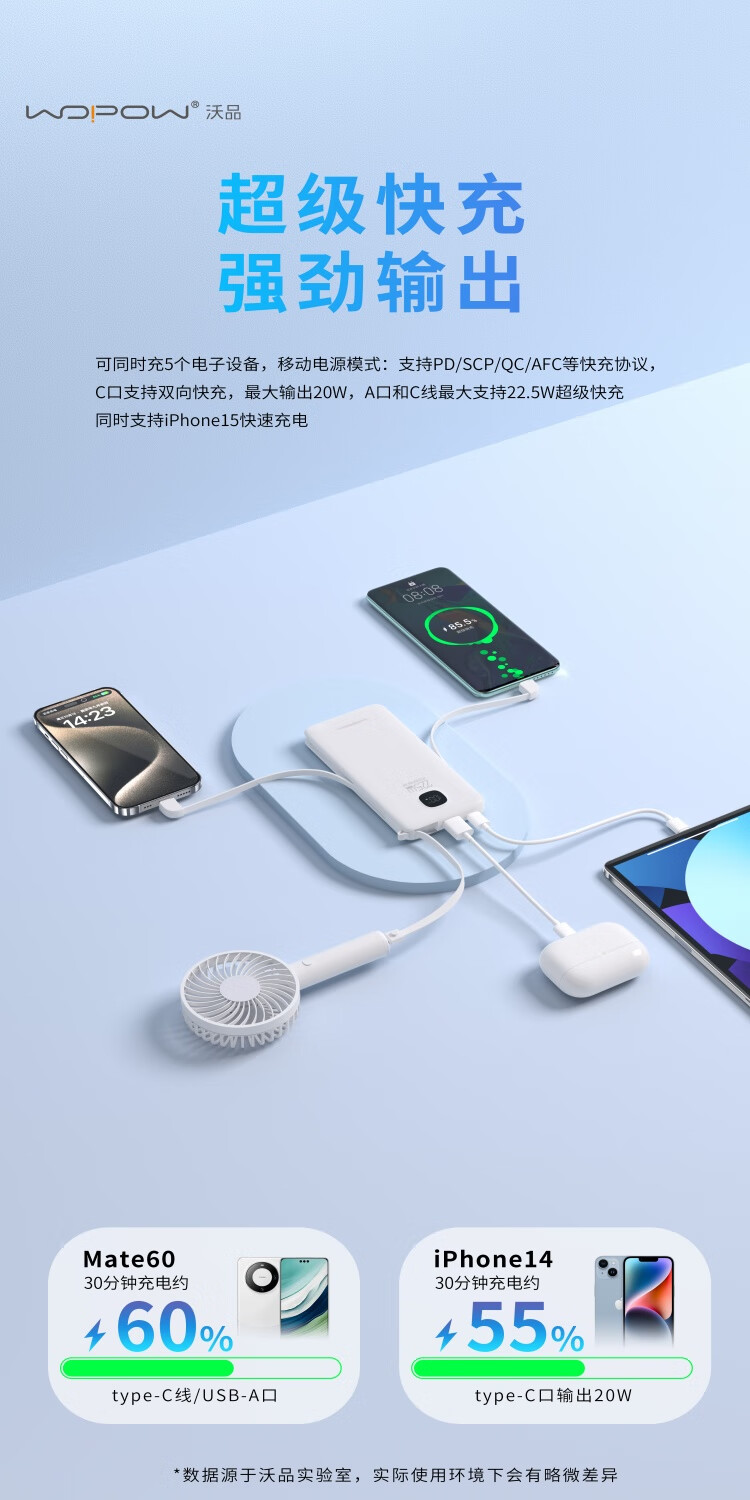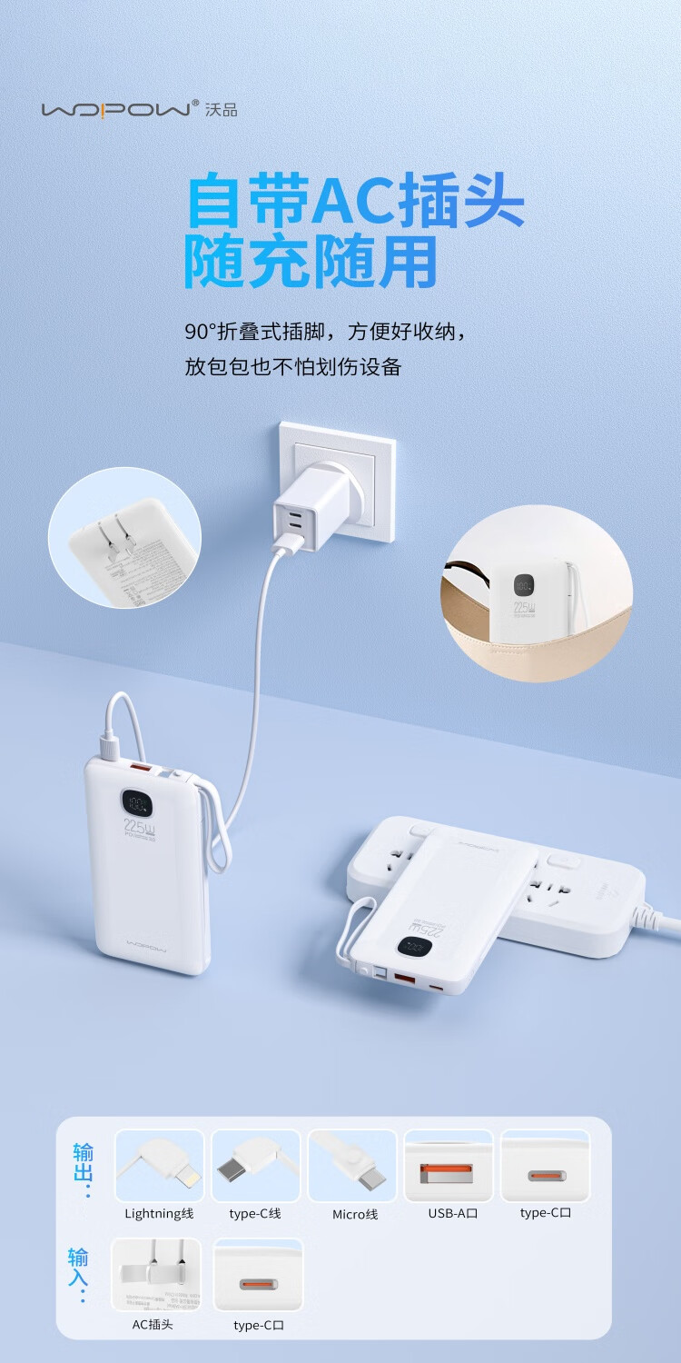 沃品/WOPOW PA005 手机充电器 三合一】充电宝自带线10000毫安时大容量快充带AC插头