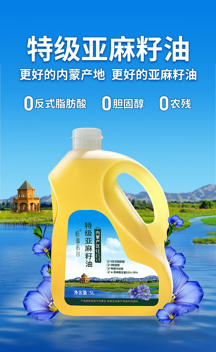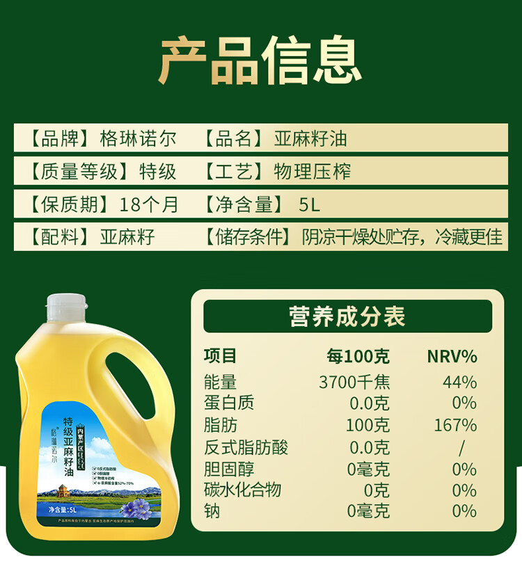 格琳诺尔 5000 冷榨亚麻籽油 0反亚麻籽油5L 特级冷榨胡麻油 内蒙古特产食用油