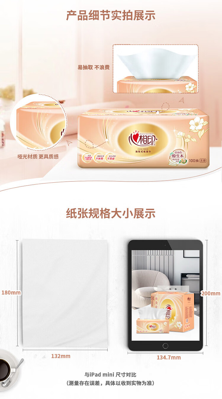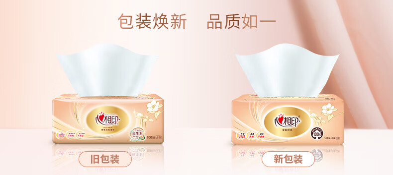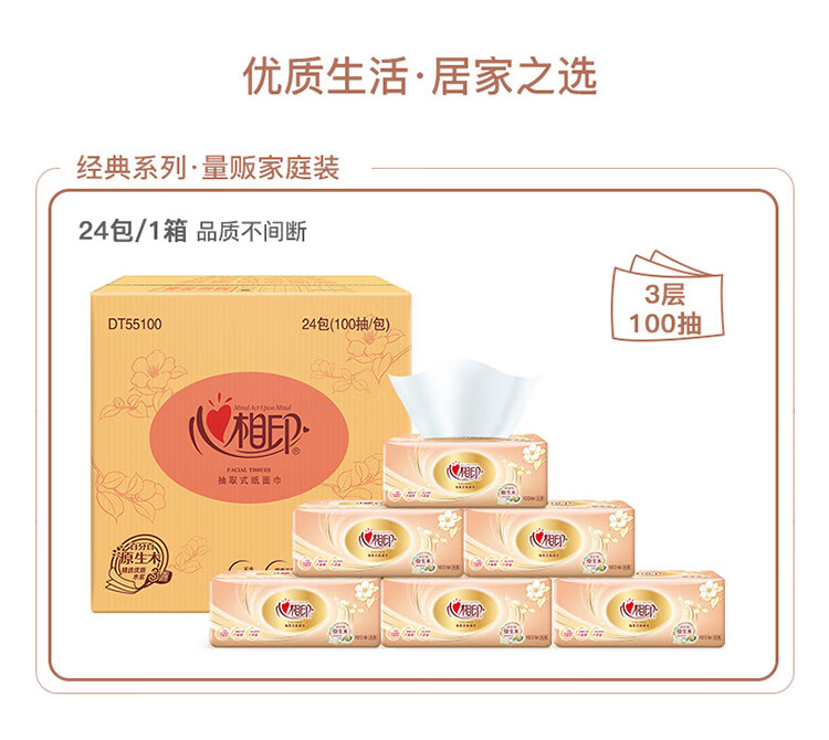 心相印/MindActUponMind DT55100 软包抽取式面纸 金装经典系列24包100抽3层塑装纸面巾 8包*3提-箱装