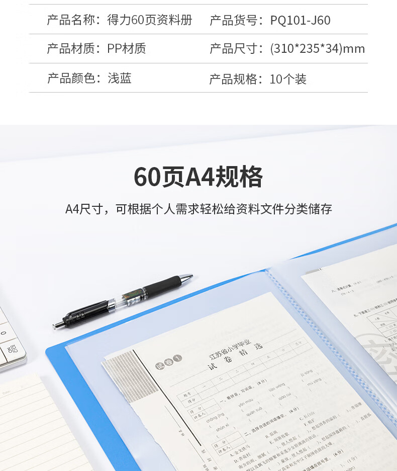 得力/deli PQ101-J60 文件夹 10只A4/60页资料册