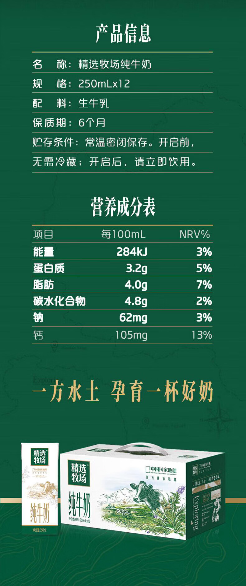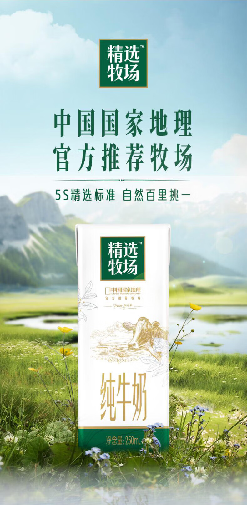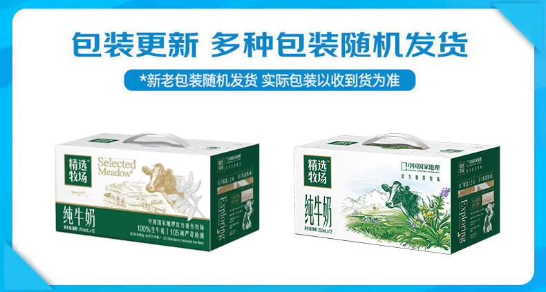蒙牛/MENGNIU 250ml*12牛奶 蒙牛精选牧场纯牛奶全脂灭菌乳利乐苗条装250ml/包*12