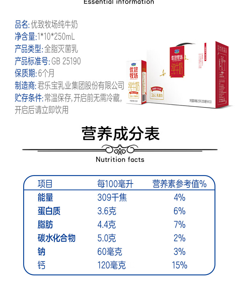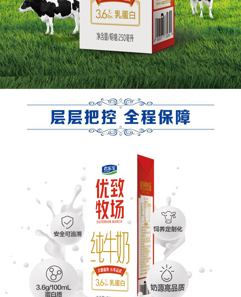 君乐宝/JUNLEBAO 250ml*10牛奶 优致牧场金装纯牛奶(原味)利乐砖1-10-250ml 180