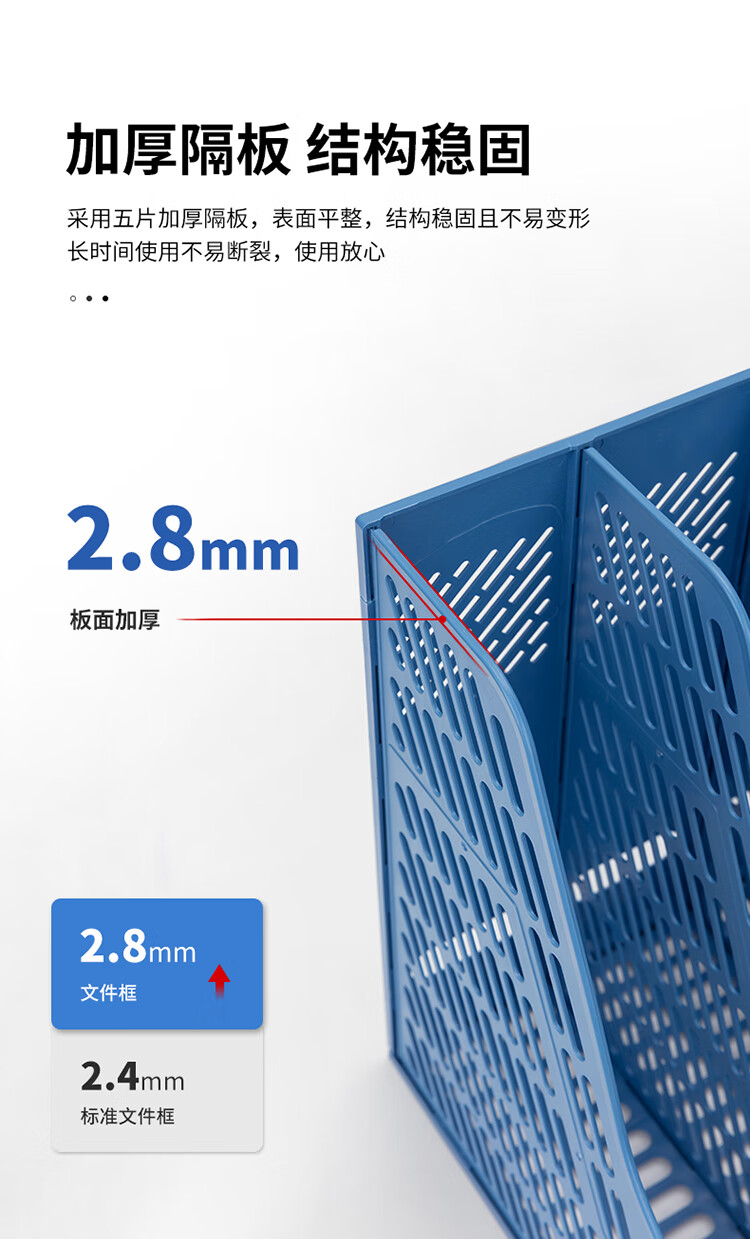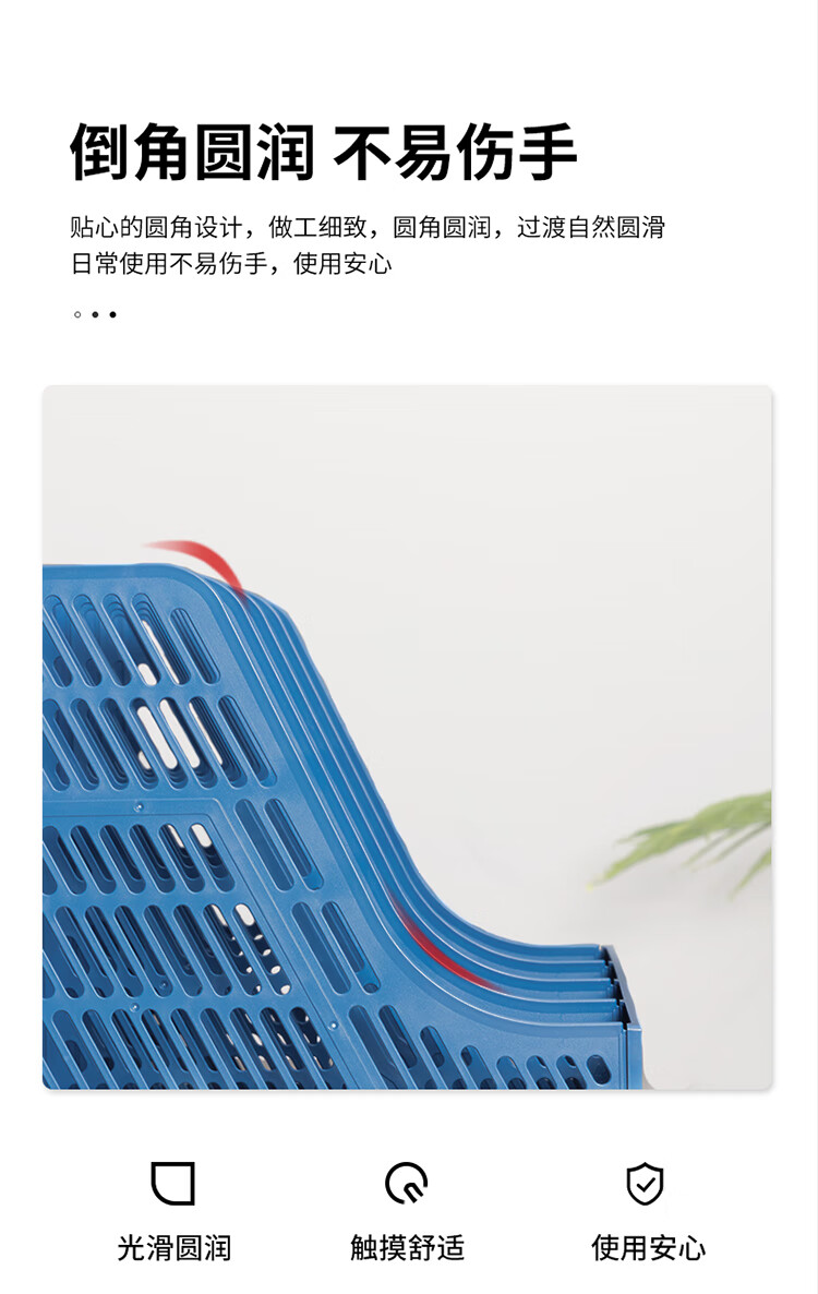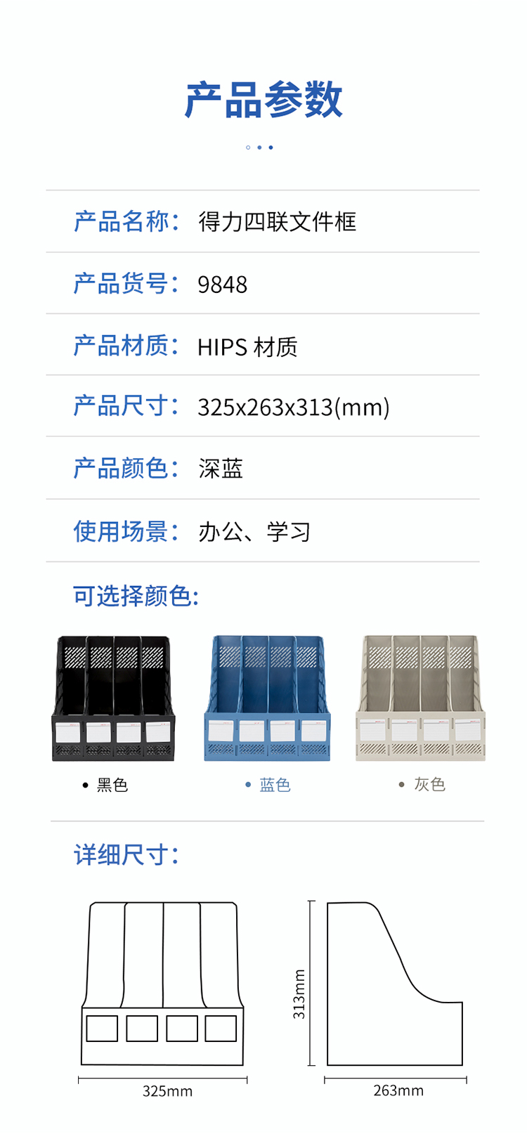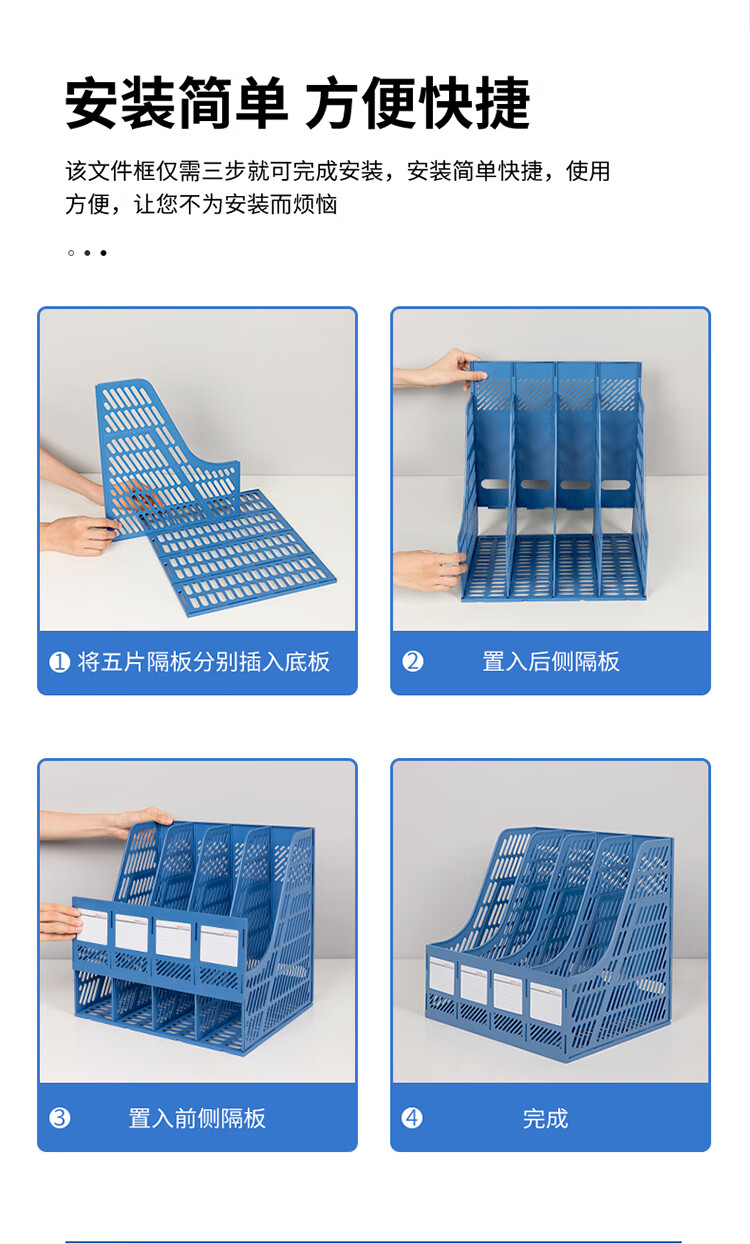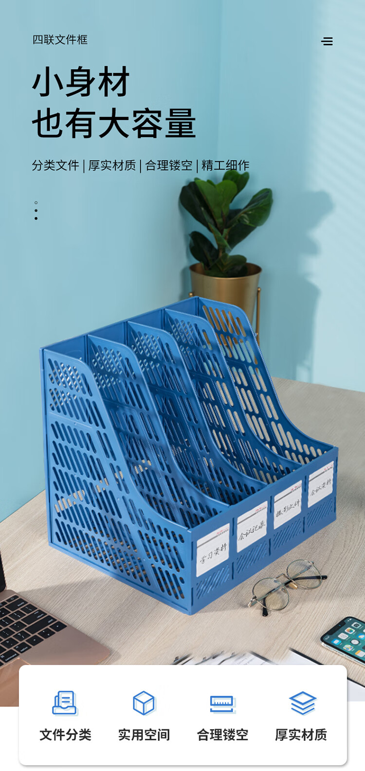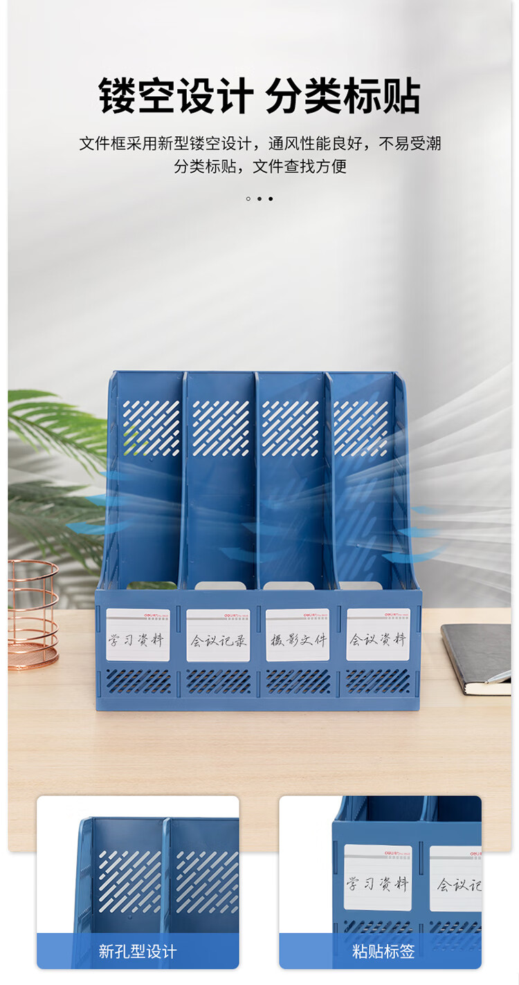 得力/deli 9848 文件筐 4联镂空桌面文件框栏书立架档案收纳盒 办公室带标签资料文件置物架书本资料收纳神器 蓝色