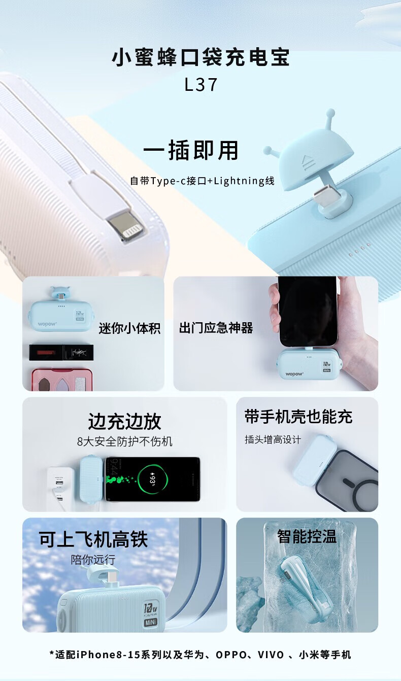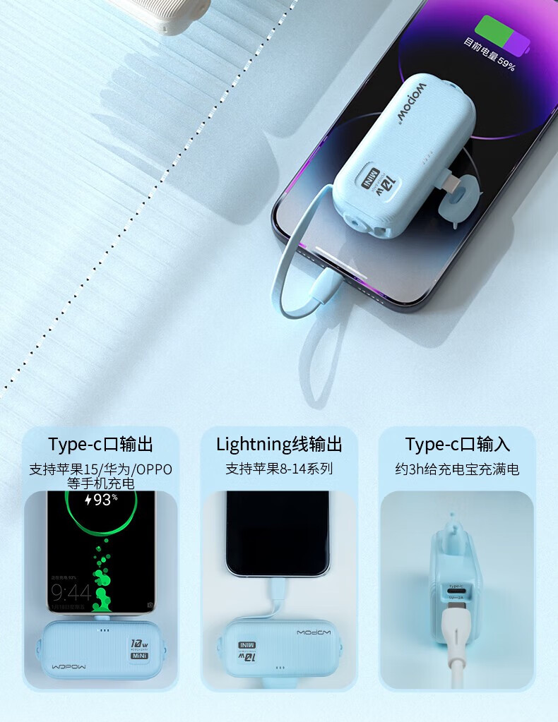 沃品/WOPOW L37 手机充电器 莫迪兰色系自带线移动电源 米色 5000mAh