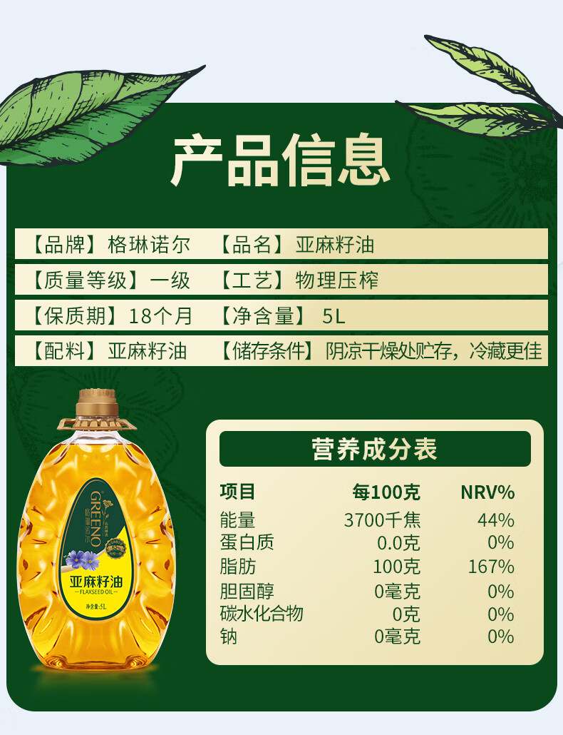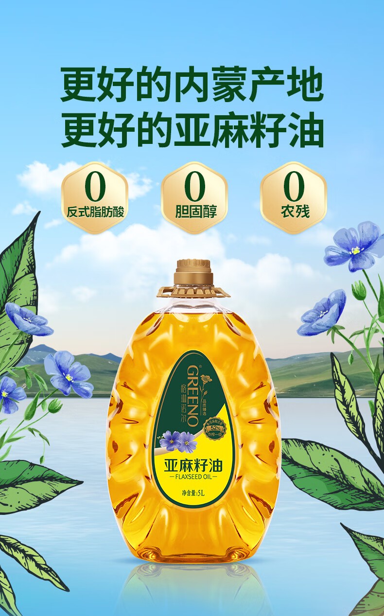格琳诺尔 5000 冷榨亚麻籽油 一级食用油热炒油内蒙古胡麻油适合孕妇月子油 5L