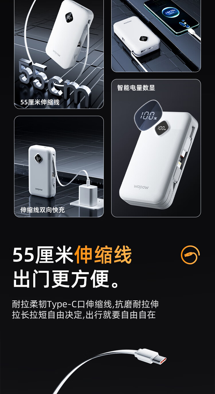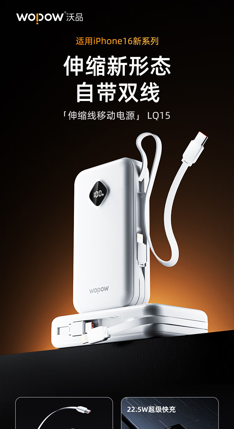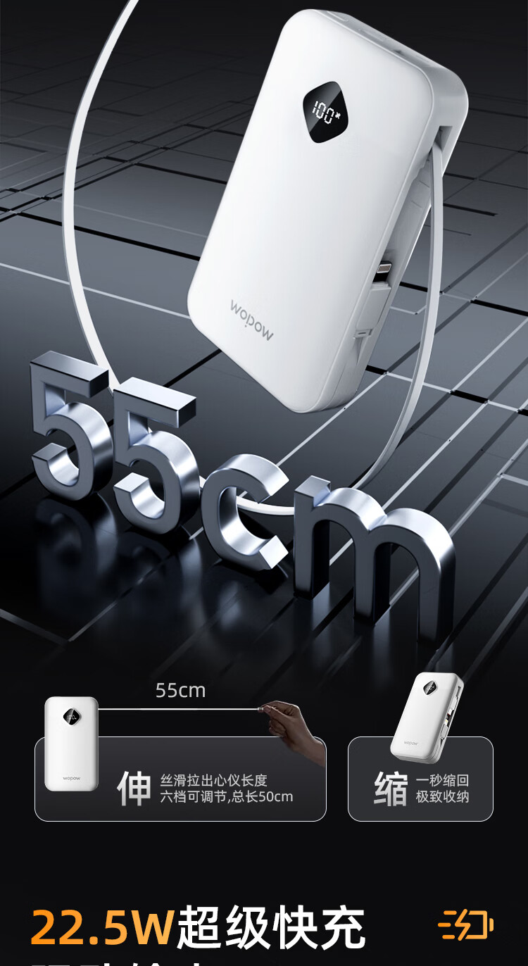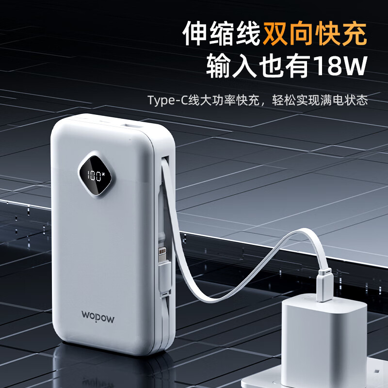 沃品/WOPOW LQ15 手机充电器 伸缩线移动电源 10000毫安充电宝22.5w快充 小巧便携