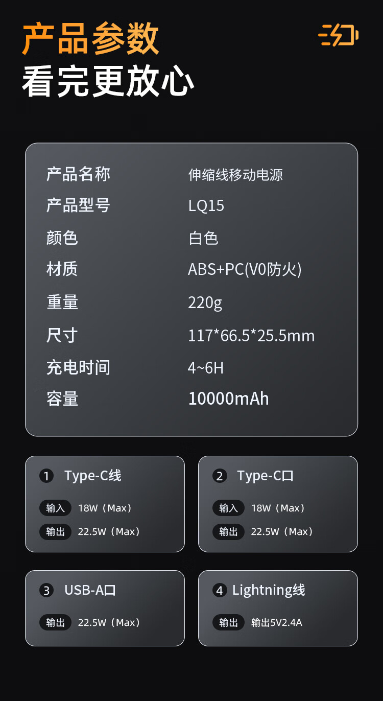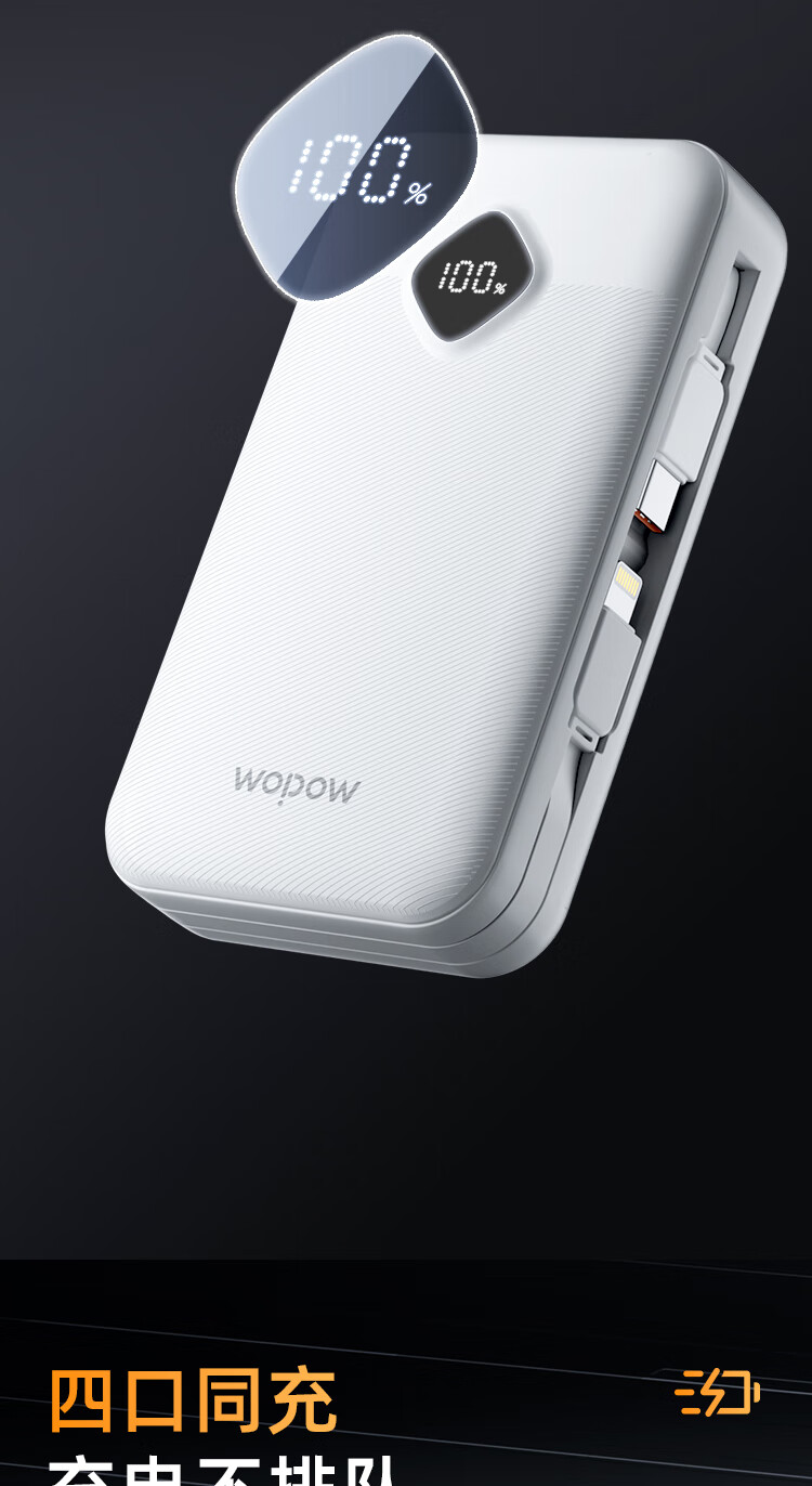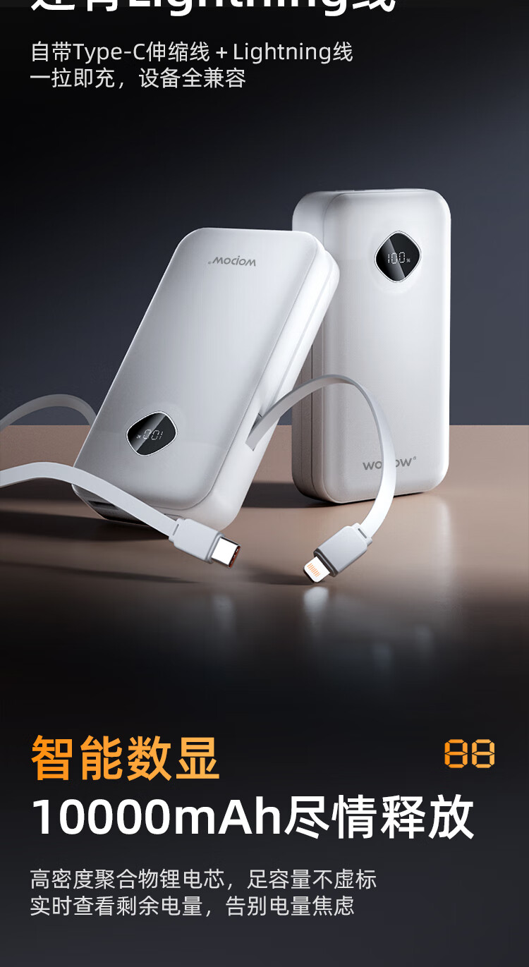 沃品/WOPOW LQ15 手机充电器 伸缩线移动电源 10000毫安充电宝22.5w快充 小巧便携