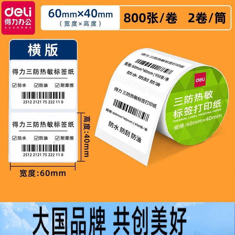 得力/deli 60*40标签打印纸/条码纸 防水防油不干胶多规格打印纸 横版 宽60*高40(2卷/筒共1600张)