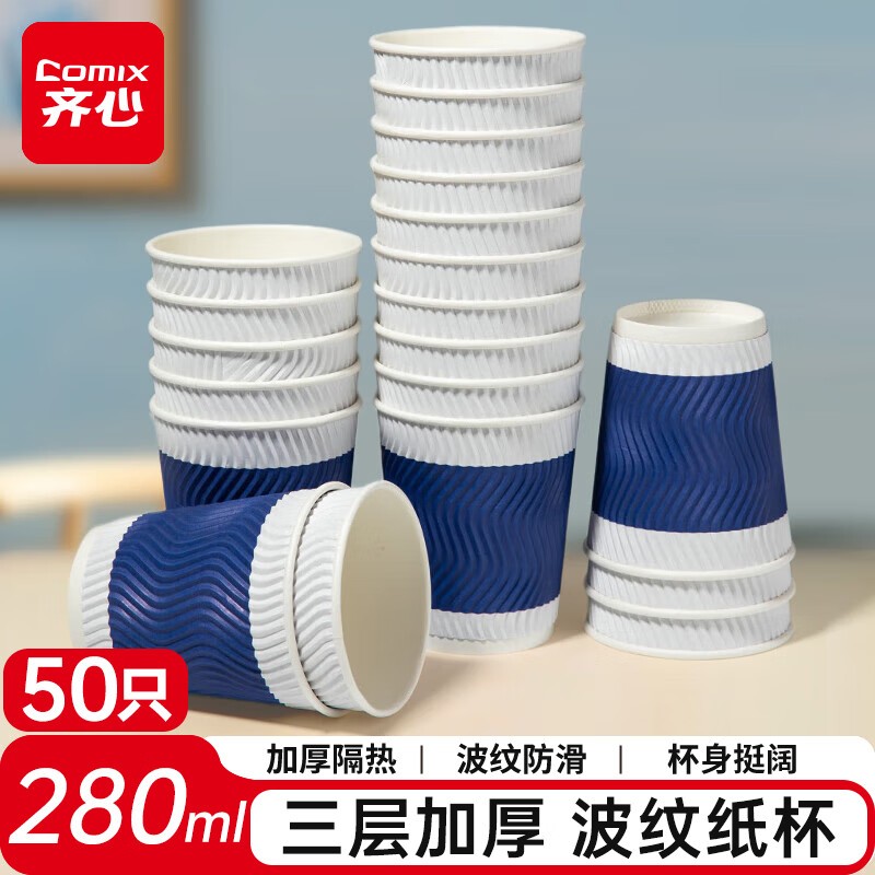 齐心/COMIX 280ml*50一次性杯子 三层加厚咖啡杯 办公用品 蓝