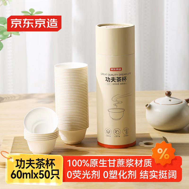 京东京造 60ml*50一次性杯子 可降解甘蔗浆烧烤露营加厚耐用水杯60ml
