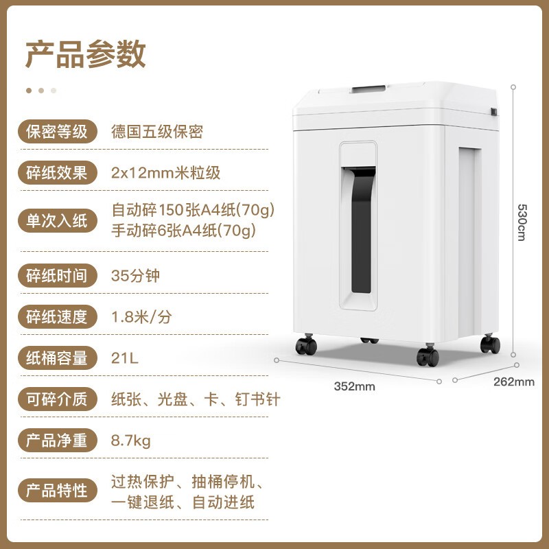 机 碎光盘5级高保密办公商用粉碎机(全自动150张 持续35分钟 21L )