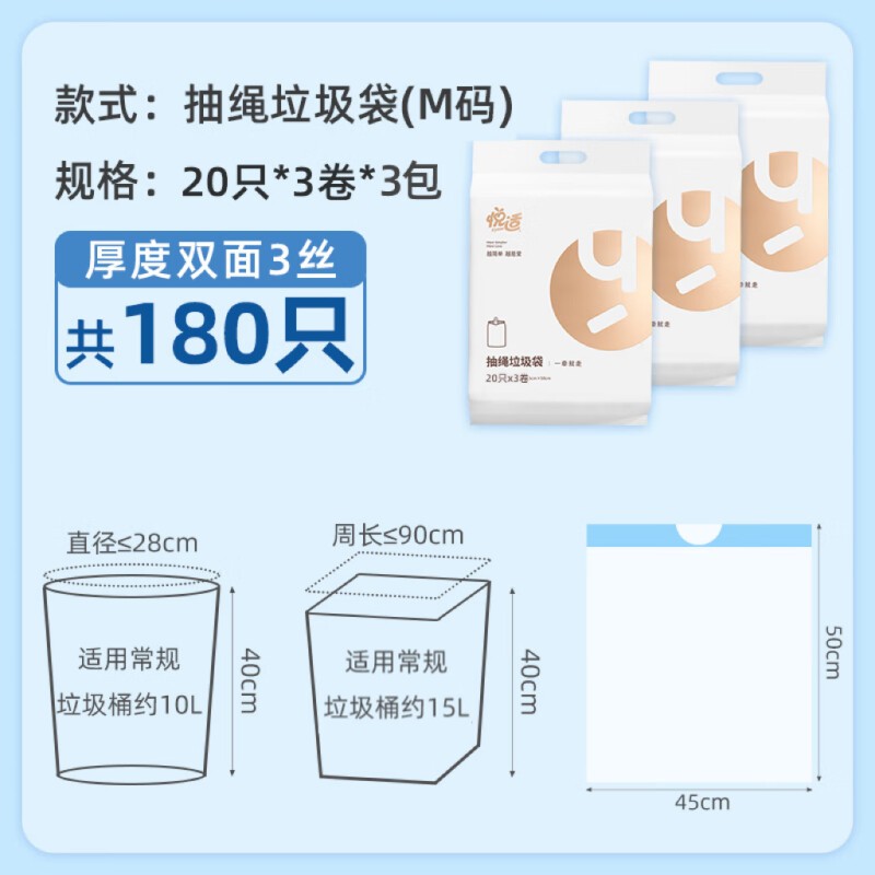 悦适/h\'yeas 3QZCKE060 塑料制品 (包装)悦适抽绳式清洁袋垃圾袋白色3(45cm*50cm)60只装*3包