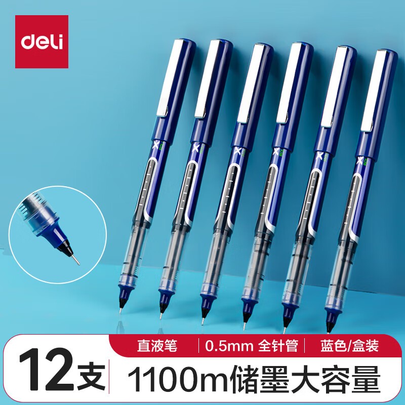 得力/deli S657 书写用笔类用具 0.5mm直液全针管走珠签字笔 办公用品学生中性笔会议笔 12支/盒蓝