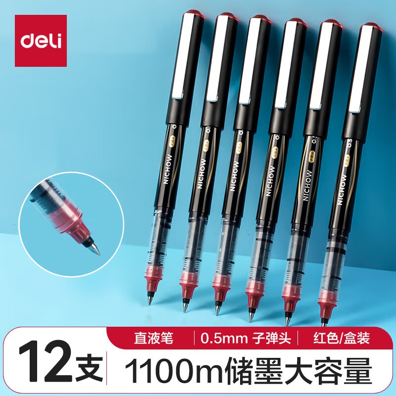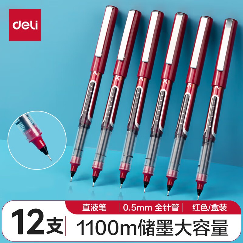 得力/deli S656-Z1 书写用笔类用具 直液笔签字笔 0.5mm子弹头办公商务中性笔 水笔走珠笔 红色 12支/盒