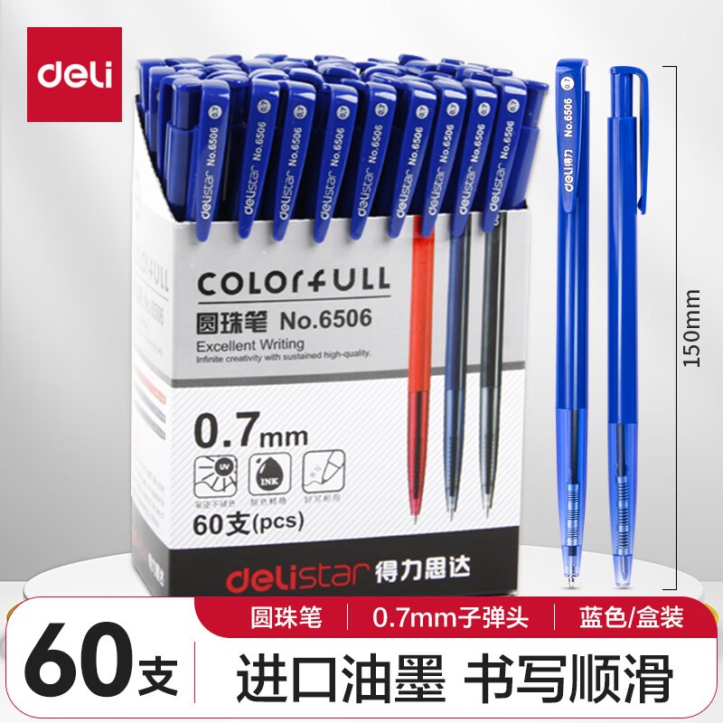 得力/deli 6506 书写用笔类用具 0.7mm按动60支圆珠笔中油笔 蓝色原子笔 办公用品
