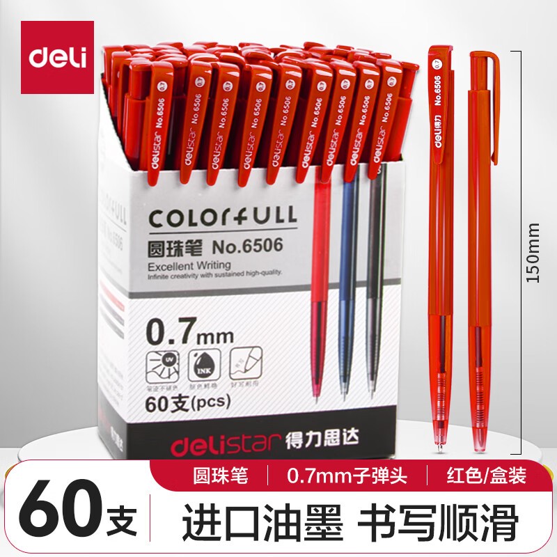 得力/deli 6506 书写用笔类用具 圆珠笔中油笔 0.7mm子弹头按动笔原子笔 办公用品 红色 60支/盒